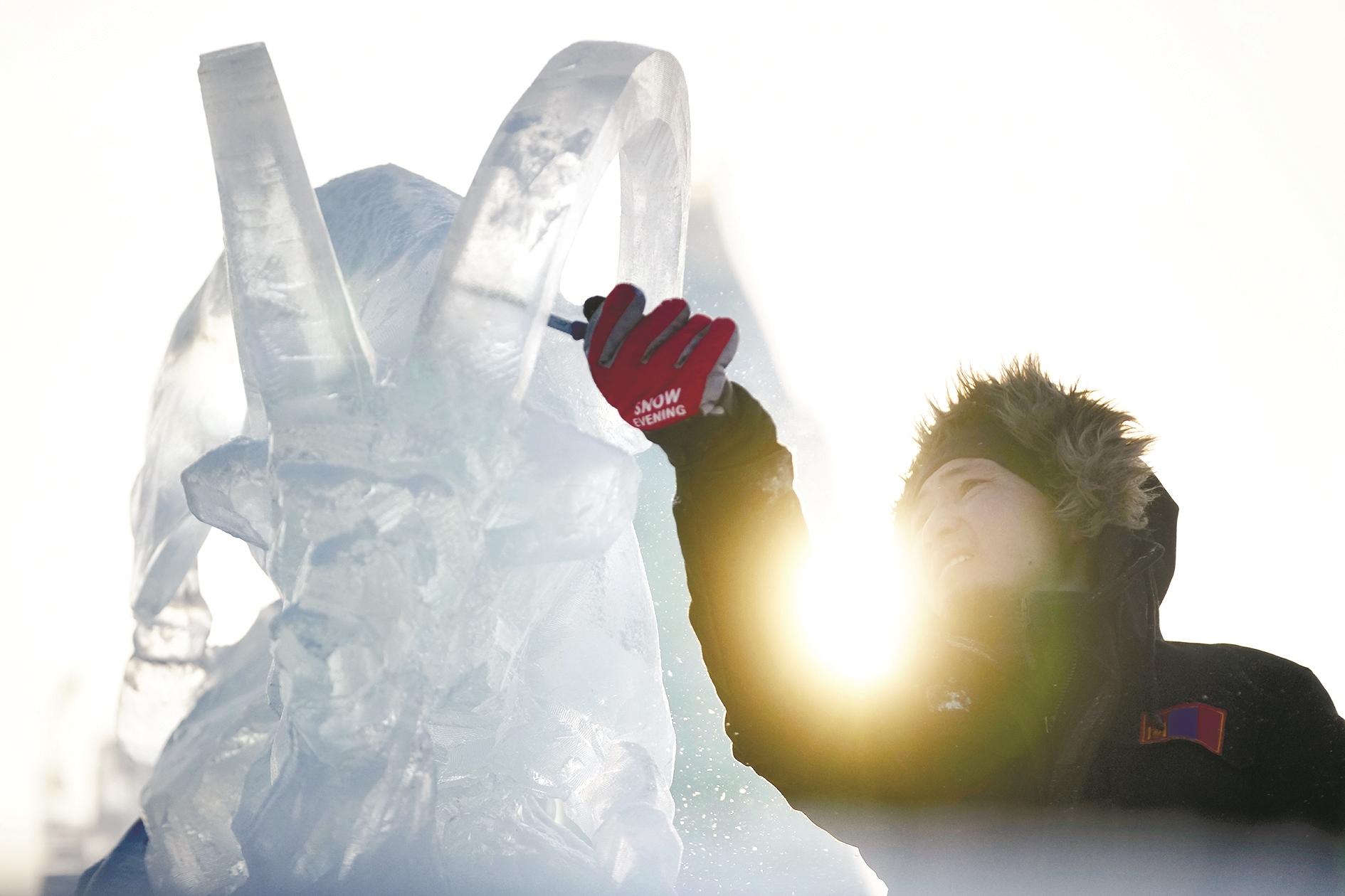 1月3日,参赛选手在进行冰雕创作。当日,在哈尔滨冰雪大世界进行的第35届中国·哈尔滨国际冰雕比赛进入第二天的赛程,来自世界各地的30余支参赛队伍精心雕琢,尽显哈尔滨冬季极寒之美。