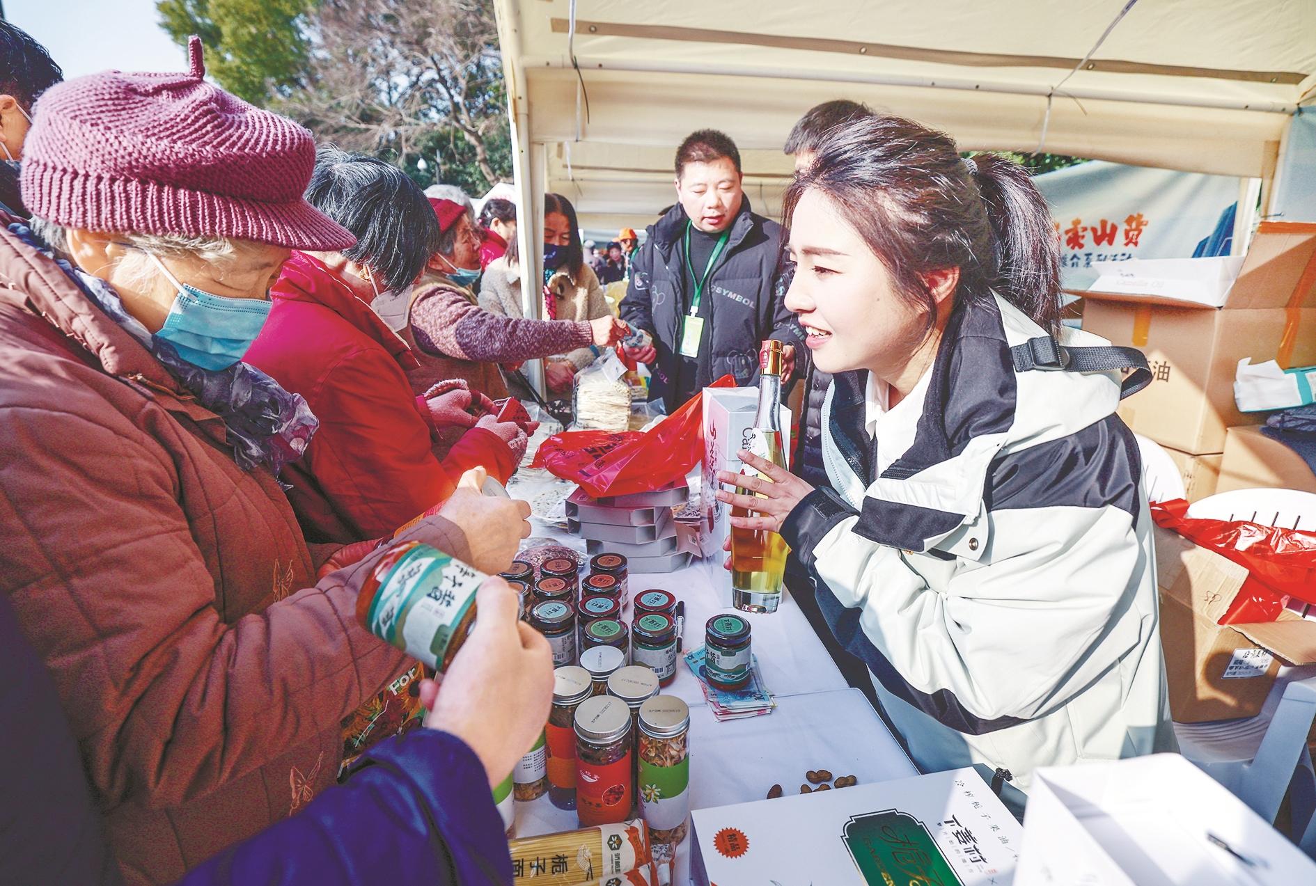 1月6日,淳安县枫树岭镇下姜村党总支书记、村委会主任姜丽娟(右)在下姜村的展位前介绍本村的特色农产品。当日,在杭州市运河广场,浙江省杭州市淳安县23个乡镇的基层书记们带着100多种淳安千岛湖优质农产品,参加淳安“书记进城卖山货”暨千岛湖农产品推介系列活动,吸引市民纷纷驻足品尝挑选。