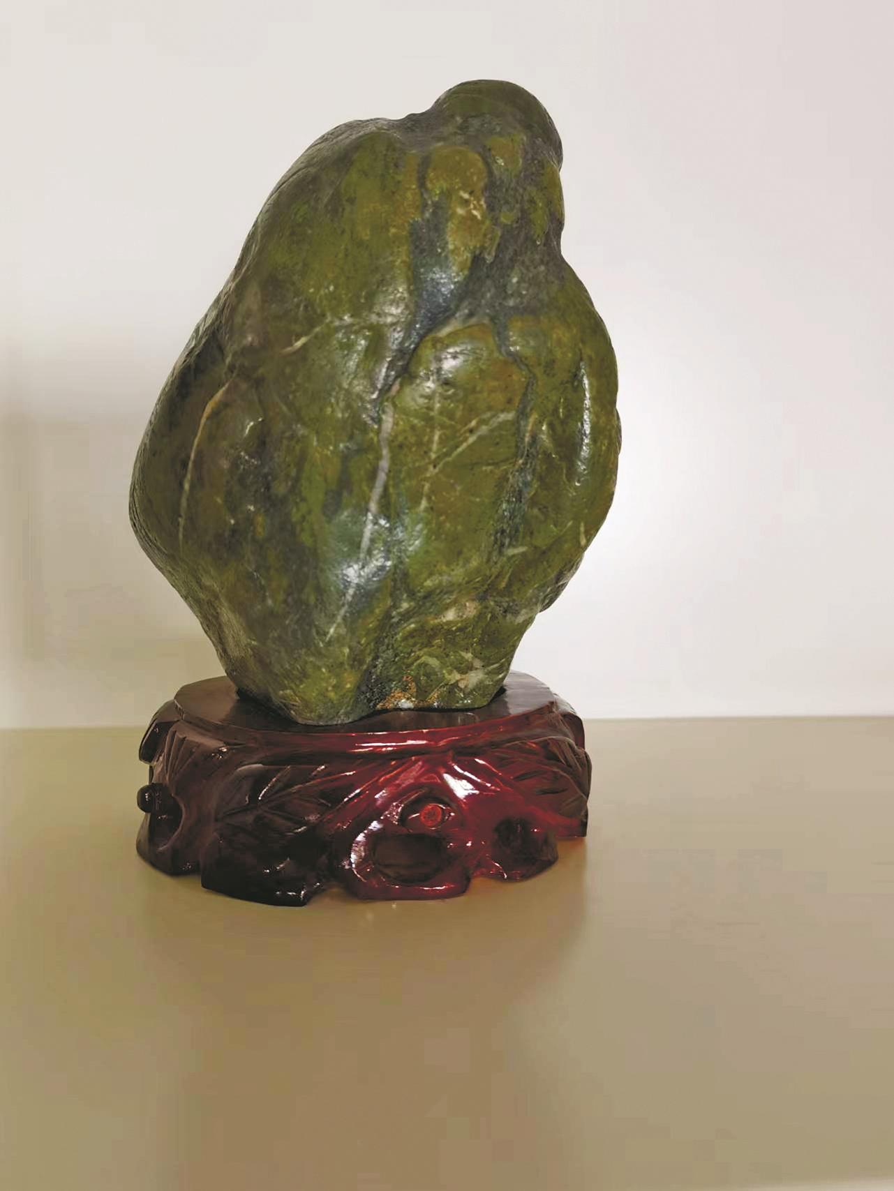 这是一块出自新疆的石头,当地人称其为绿泥石。如果玉化了,则叫藏玉,因其类似于藏玉。十年前的展会上,经常出现此类石种,很受一部分石友的喜爱,尤其带有禅意形状的绿泥石。