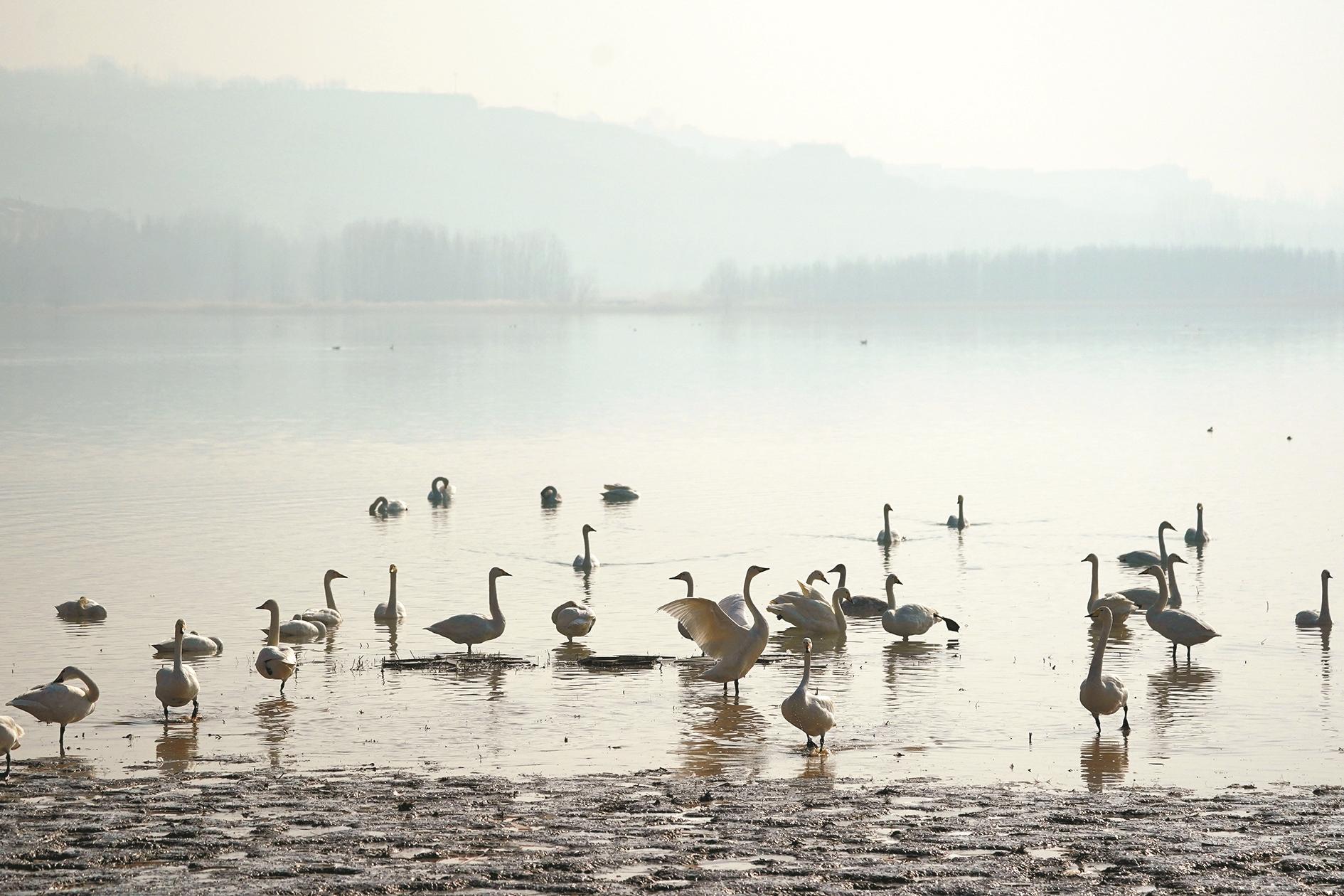1月9日,白天鹅在山西平陆黄河湿地栖息。占地6000多公顷的山西平陆黄河湿地位于山西、河南两省交界处,这里气候温和、采食丰富,非常适宜白天鹅越冬。每年秋末冬初,白天鹅就会成群结队地从俄罗斯西伯利亚地区陆续飞临这里越冬。 新华社记者 詹彦 摄