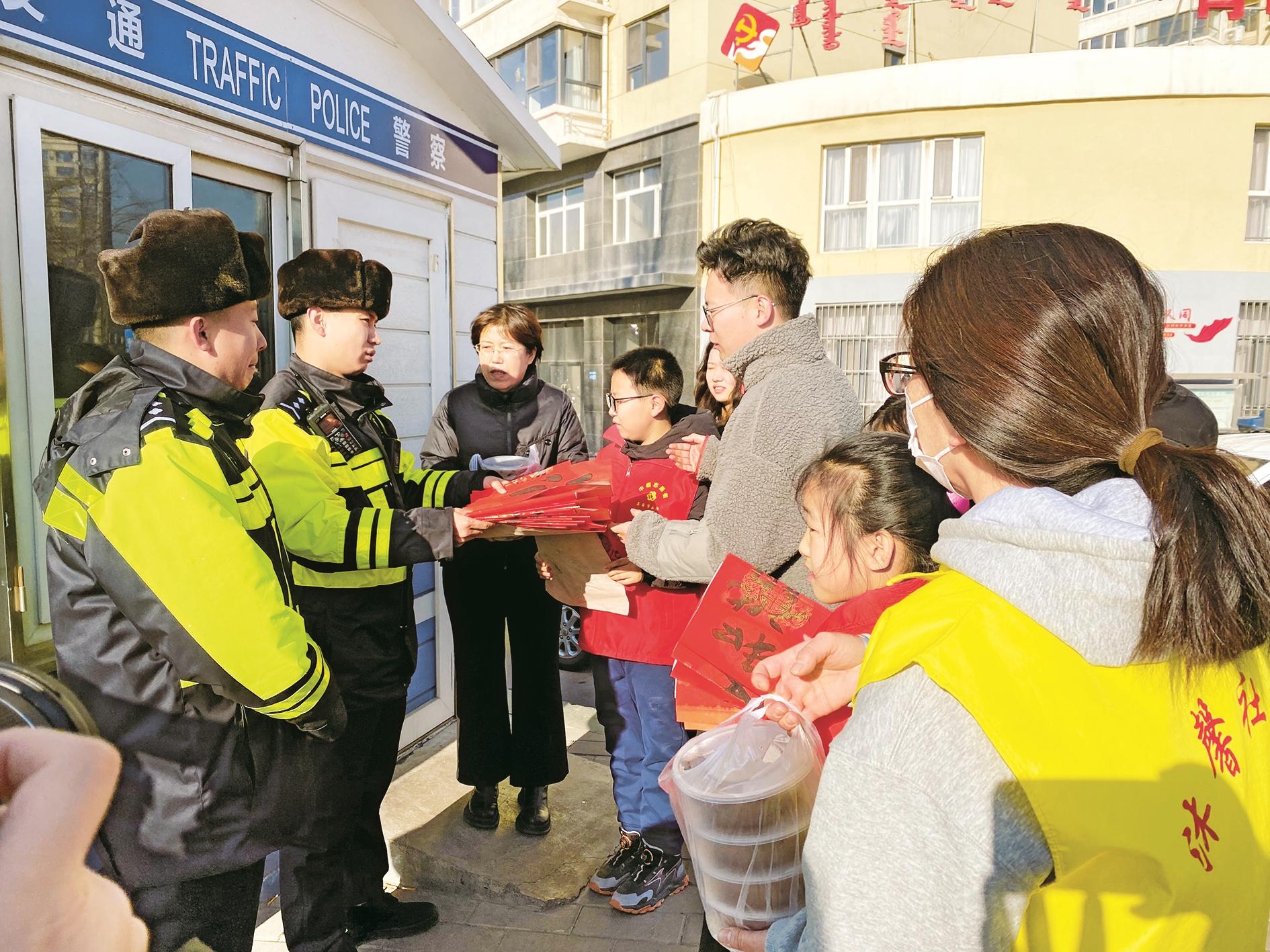 1月12日,海勃湾区海北街道青山社区党委联合市一中2个党支部和海北街道社工服务站,开展了“我在新时代文明实践站过新年·腊八节”主题志愿服务活动。活动中,市一中老师讲述了腊八节的起源和历史,社区居民分享了腊八粥的制作方法。随后,市一中书法老师和社区书法爱好者现场写春联,并将春联、腊八粥送给辖区独居老人、老党员、交警等。图为志愿者为交警送春联。 (曹艺 摄)