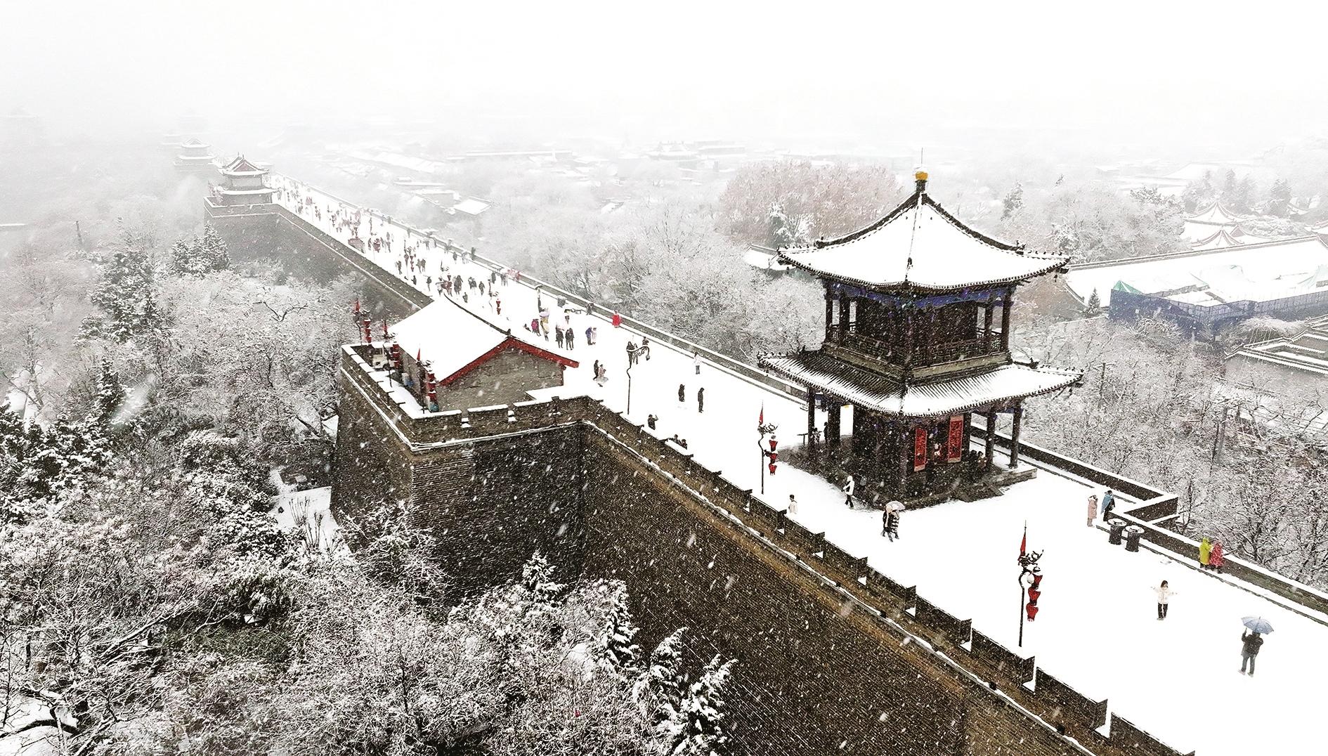 1月16日拍摄的西安城墙(无人机照片)。当日,西安迎来降雪。