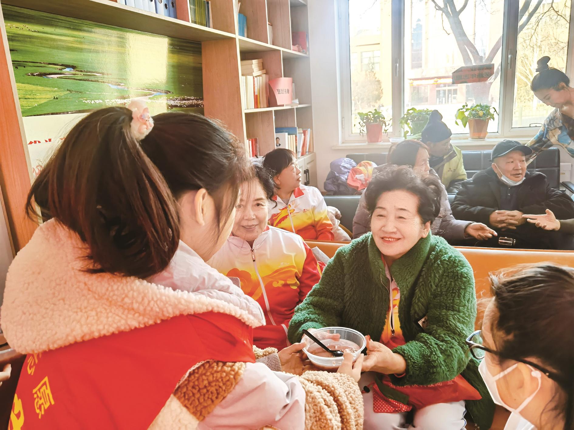 1月17日,海勃湾区海北街道佳苑社区联合区工信和科技局共同举办了“腊八粥香送安康,亲邻美好在身边”志愿服务活动,为老人送上暖心腊八粥。(毕晓敏 摄)