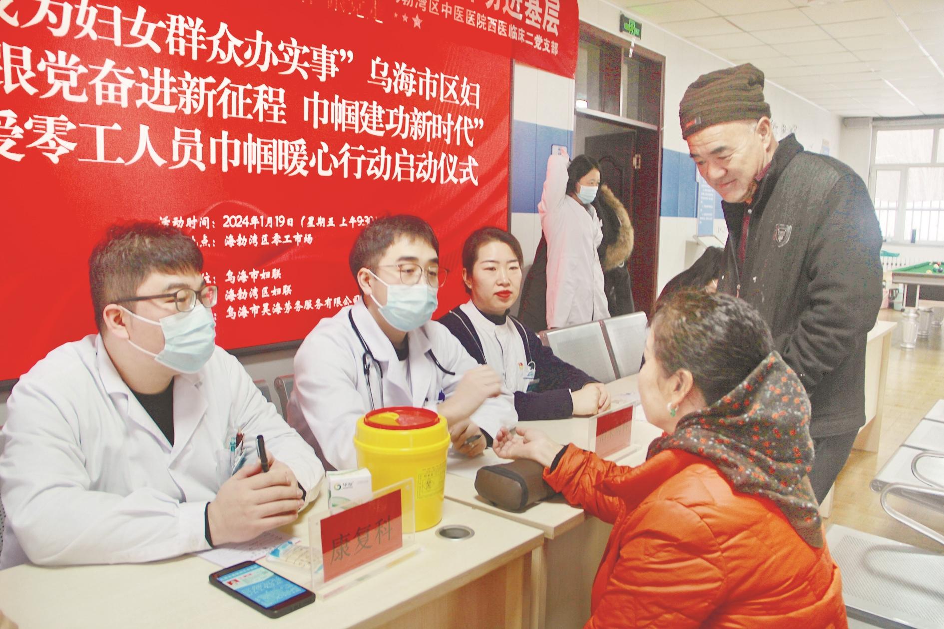 1月19日,市妇联联合海勃湾区妇联在零工市场举行“我为妇女群众办实事”“跟党奋进新征程·巾帼建功新时代”关爱零工家庭巾帼暖心行动启动仪式。活动现场设置义诊服务区、巾帼居家养老便民服务区、春节送祝福区等8个民生服务区,开展了爱心义诊、中医按摩、心理咨询、法律咨询等服务。 (段维娜 摄)