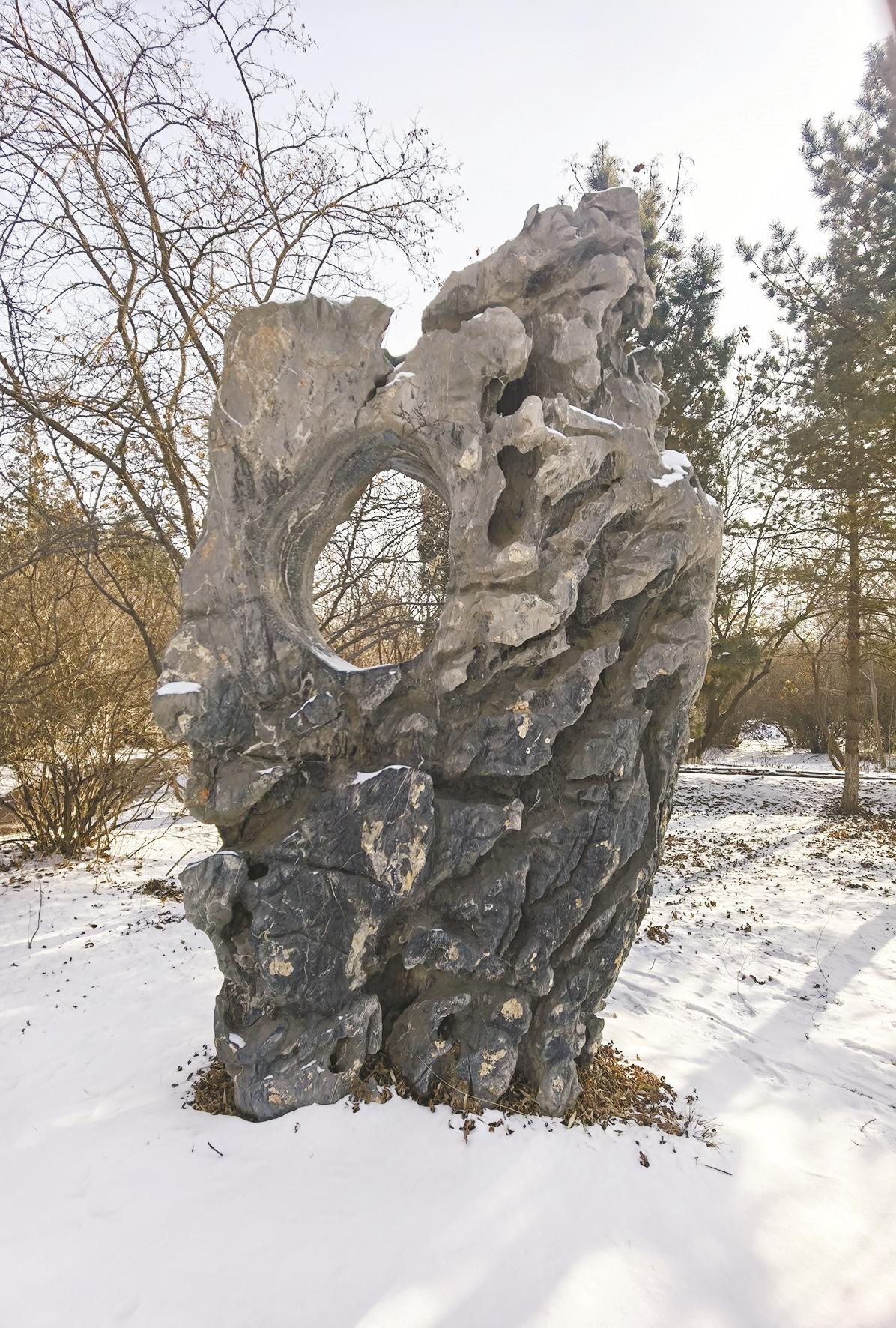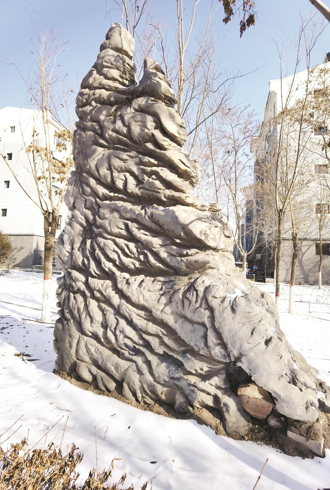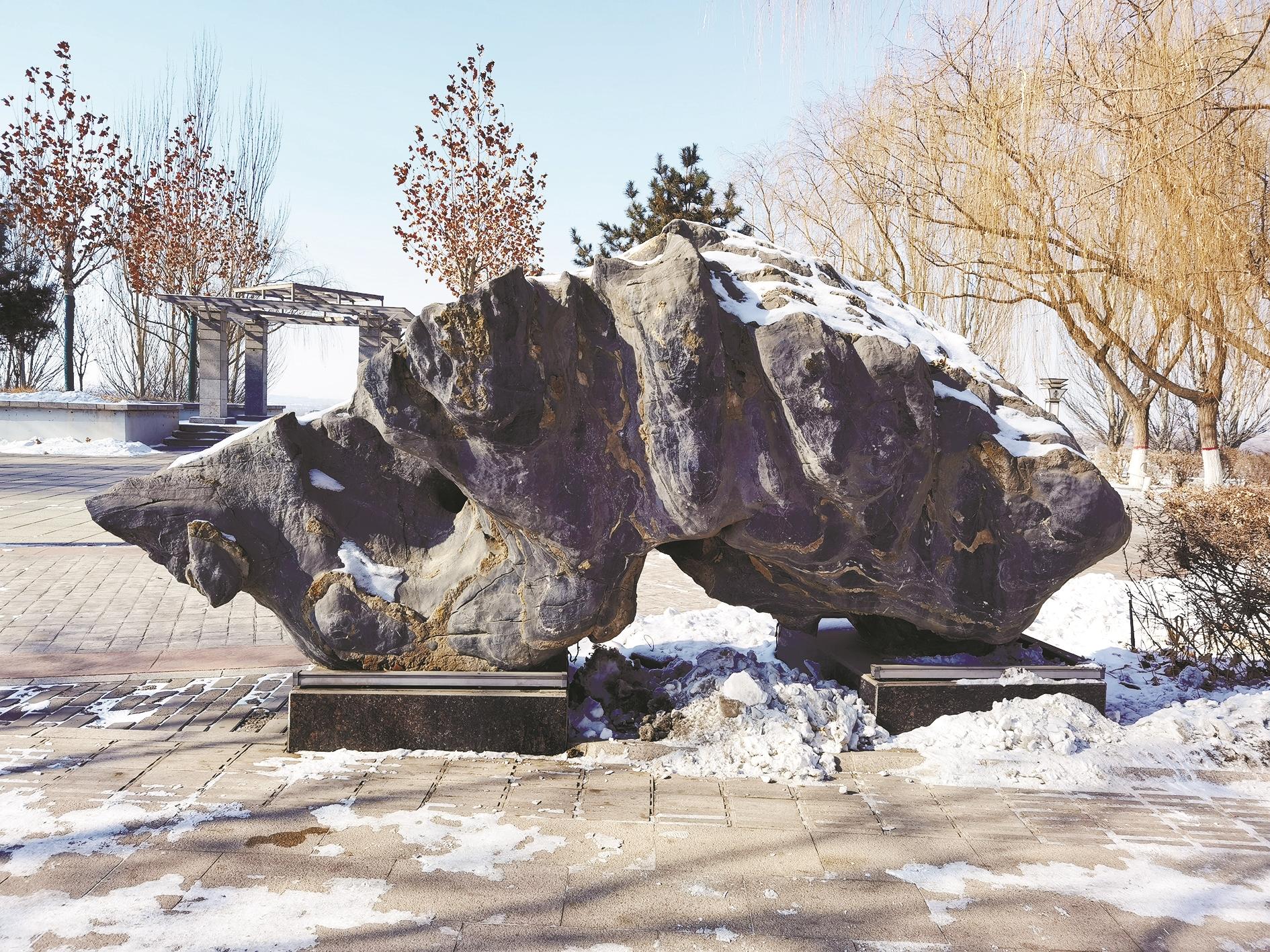 海勃湾区海北大街沿路绿地中,每隔一段便能看到或大或小、形态各异的灵璧石。细观之下,石纹褶皱缠结、肌理缜密,石表起伏跌宕、沟壑交错,造型粗犷峥嵘、气韵苍古。