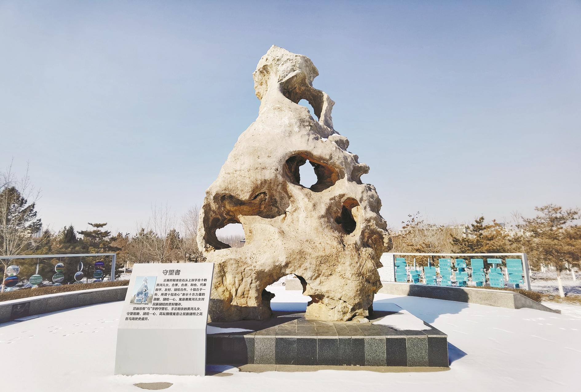 “它的正面形似坐在石头上双手合十的黄河儿女,合掌可代表和平、友好、团结,十指合于一处也表示十方力量的凝聚、团结一心,寓意着黄河儿女对民族团结的美好期许。”公园一位工作人员指着石头介绍说,石头背面形似“乌”字的“守望者”,代表黄河儿女守望相助、团结一心,花坛围绕着寓意让民族团结之花在乌海处处盛开。