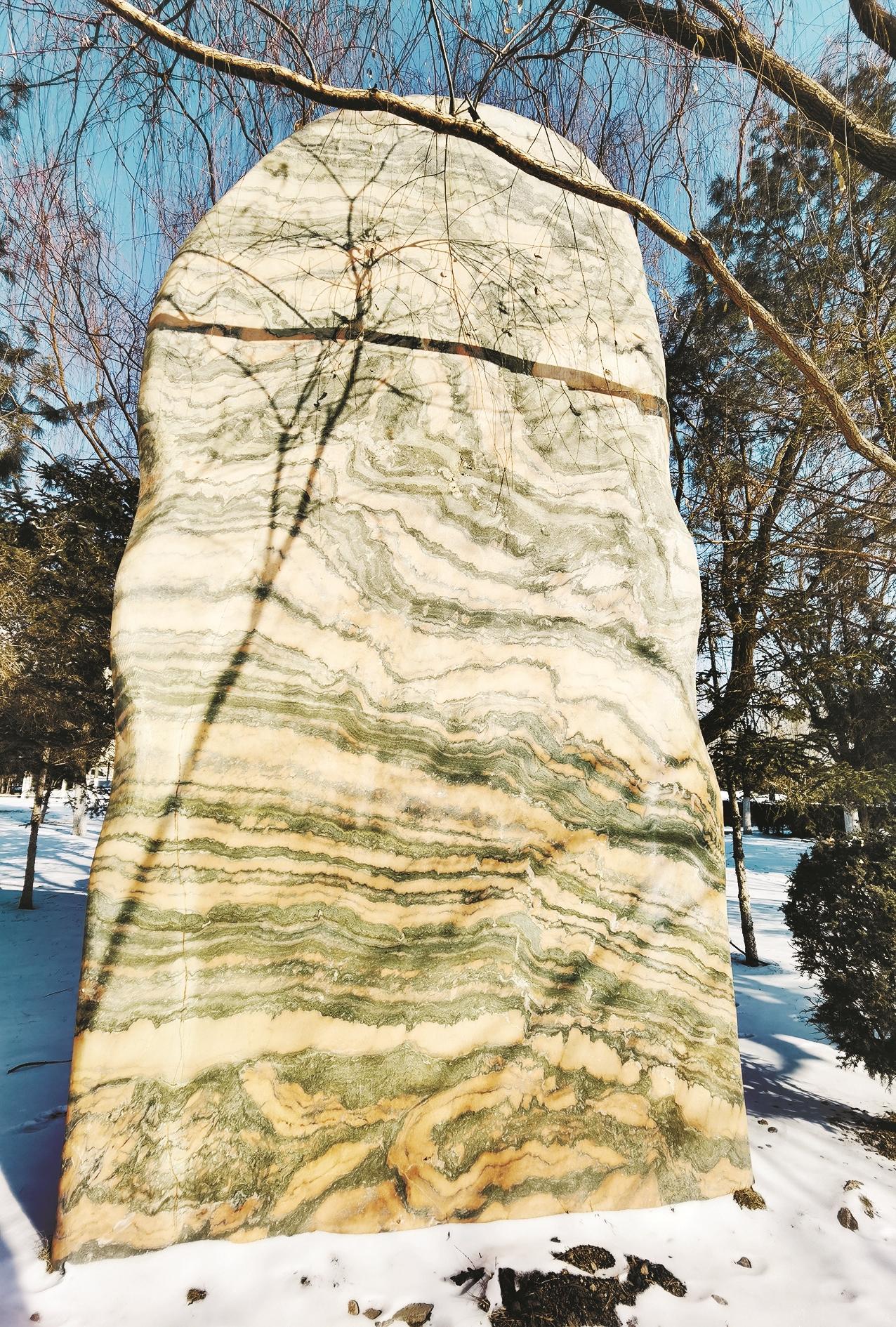 在海南区人民公园东门处,一块质地坚硬、色彩艳丽的长条形石头分外惹眼。