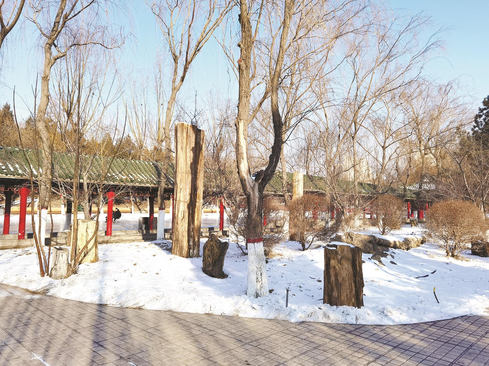 市人民公园赏石阁外围绿地由形态各异的景观石点缀,其中,一组有大有小、长短不一的硅化木格外引人注目。
