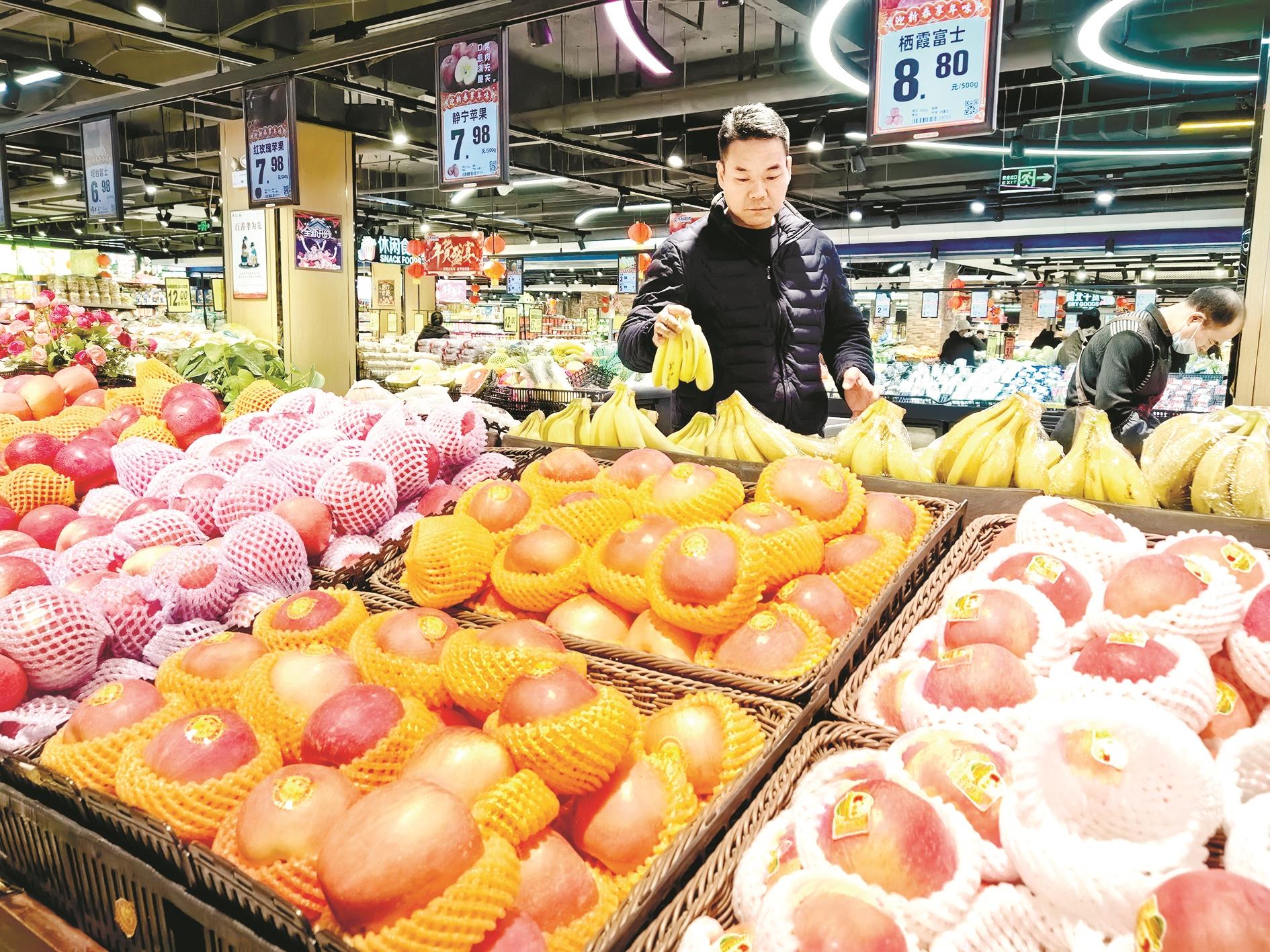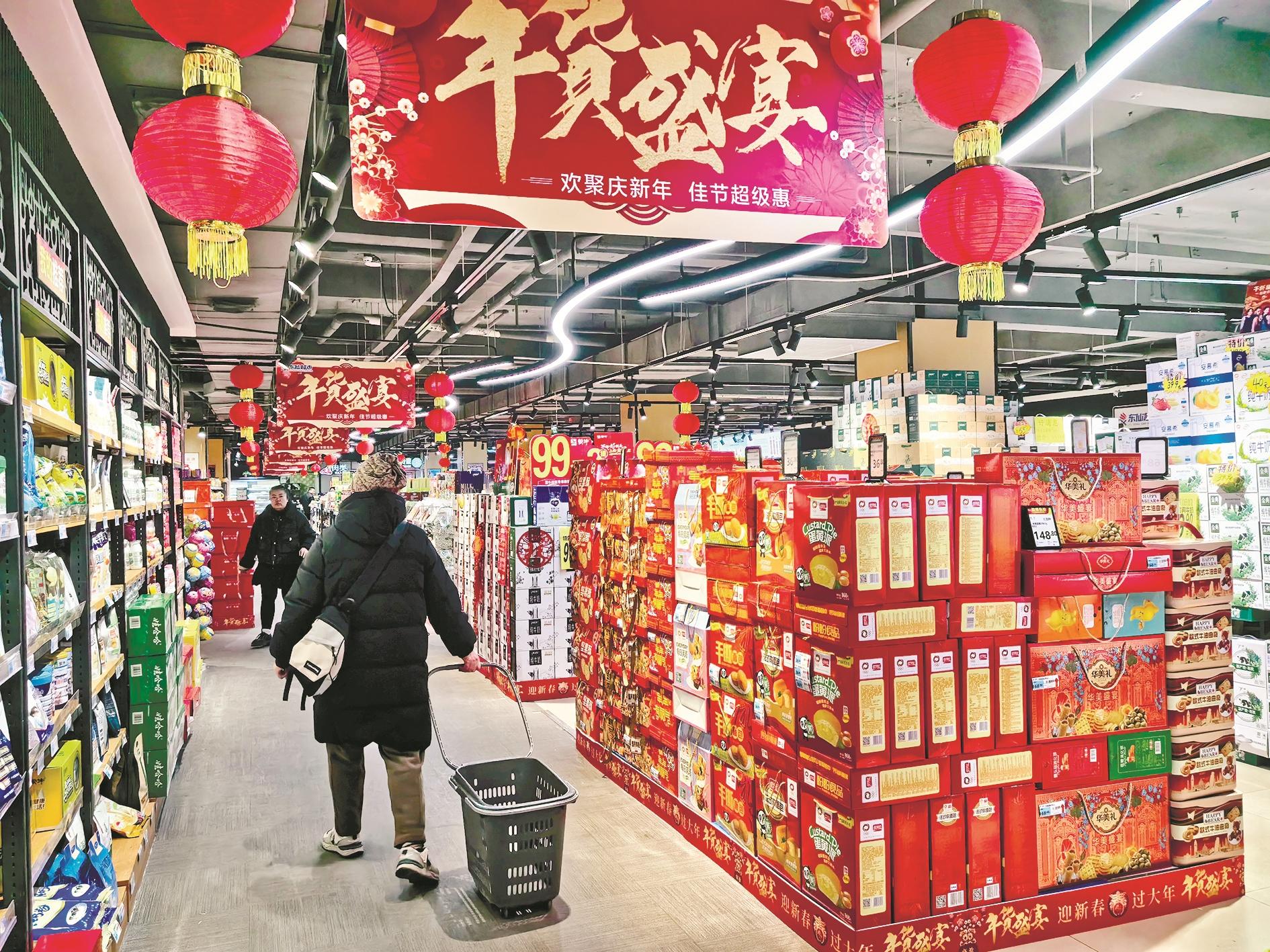 记者走访看到,在各大商场、超市,新鲜水果、肉类蔬菜、糖果点心和酒水饮料等年货正值热卖,挑选购买的人们络绎不绝。
