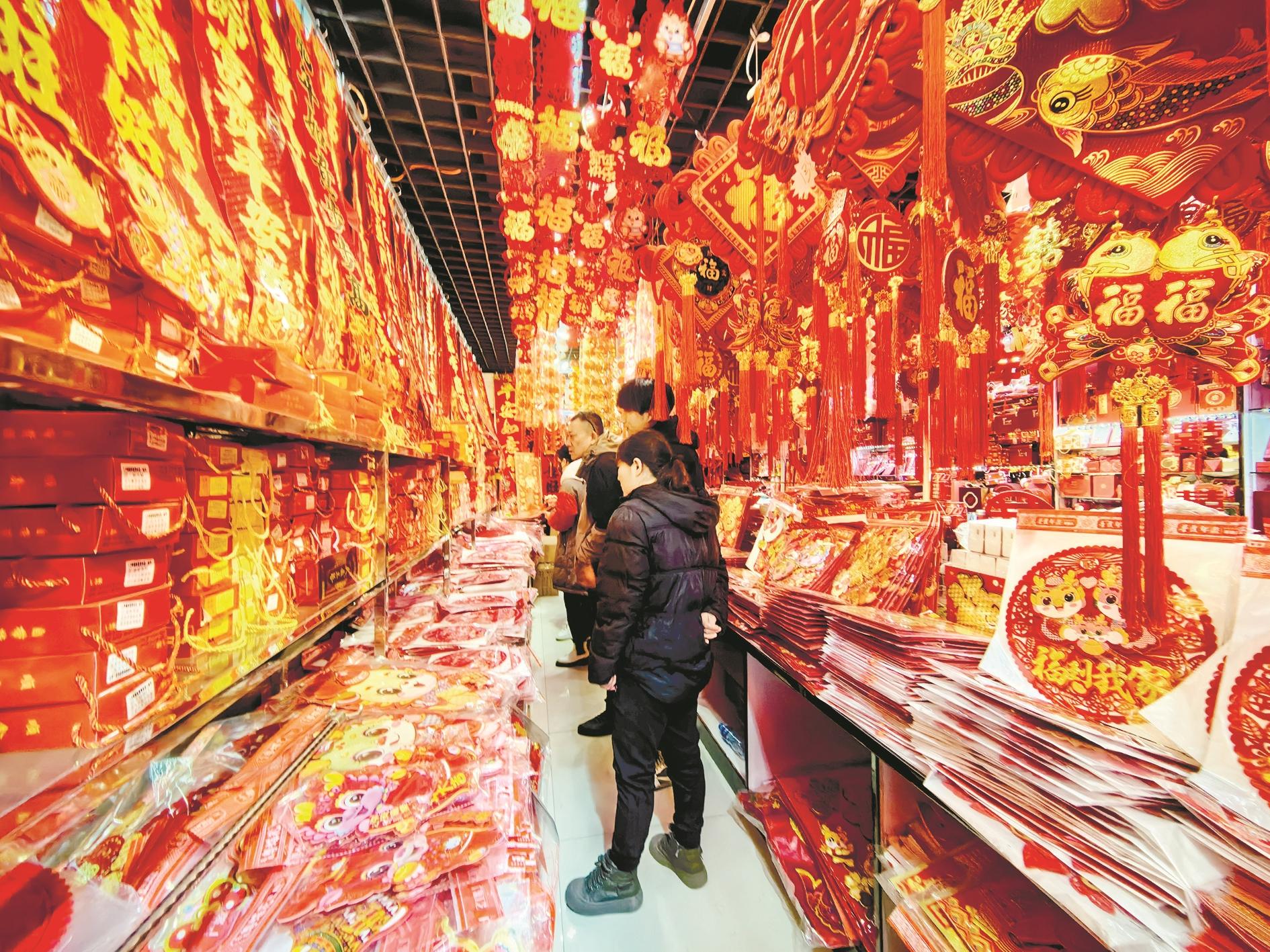 “每年生意最红火的时候就是春节前了,来采购、置办年货的人很多,店里一天的销售额能达到上万元。”富达市场某喜庆用品店店主张女士告诉记者,如今春联、“福”字等品类越来越丰富,不仅造型多样、内容不一,就连粘贴方式都越来越方便。