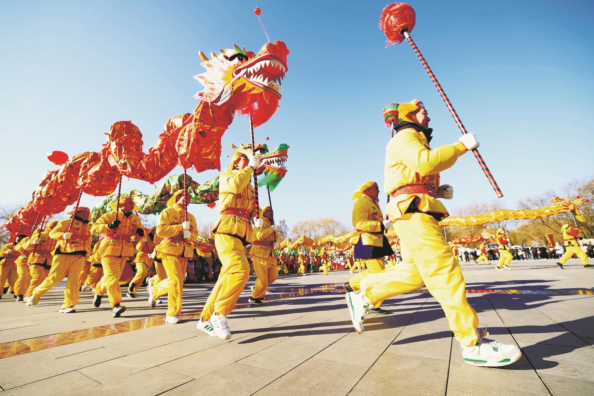 1月28日,在河北省石家庄市井陉矿区人民广场,当地群众进行舞龙表演。春节临近,各地营造出浓浓的喜庆氛围,红红火火迎新春。