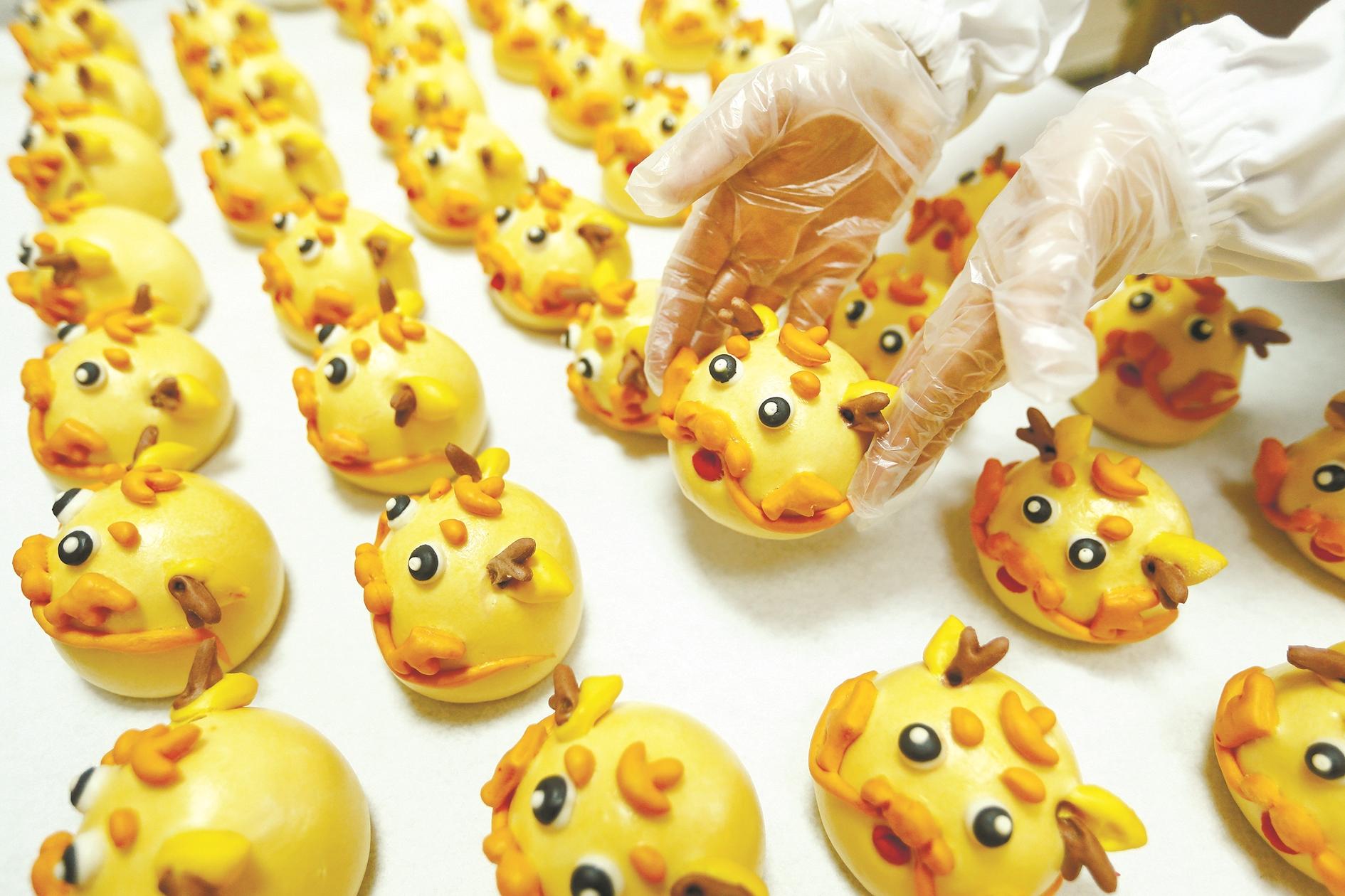 1月30日,山东省青岛市即墨区北安街道王宿庄村非遗工坊的艺人在摆放花馍。春节临近,山东省青岛市即墨区的民间艺人忙着赶制花馍等特色面食,通过“线上+线下”的销售模式供应各地年节市场。花馍是当地的特色面食,造型多样。