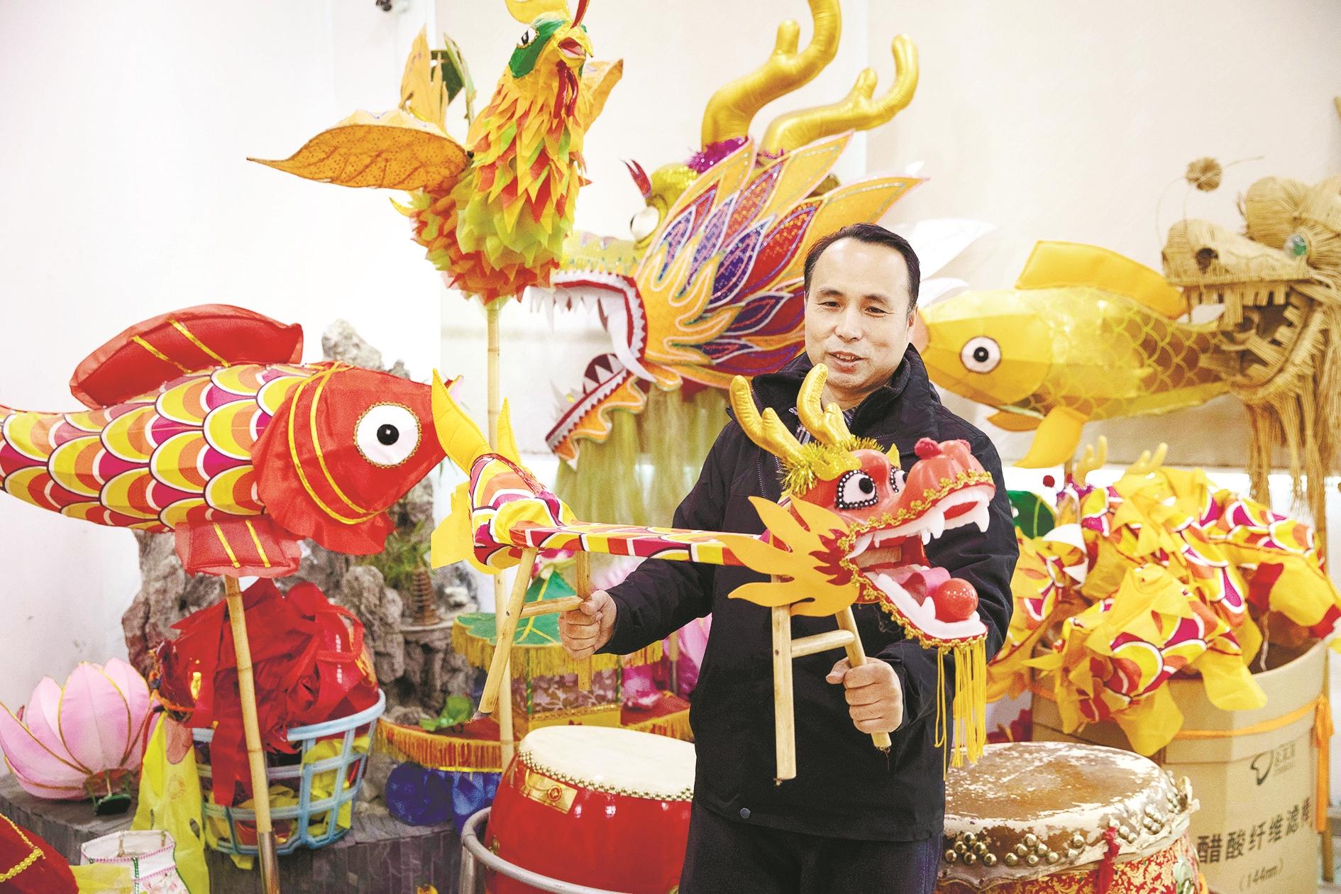 1月30日,南昌市青云谱区城南龙灯工厂,城南龙灯传承人史克滨展示为儿童设计生产的小板凳龙。起源于江西南昌青云谱区的城南龙灯是江西省级非物质文化遗产,迄今已有700余年历史。临近春节,城南龙灯工厂正在加紧生产,为龙年增添喜庆气氛。 新华社发(孙睿泽 摄)