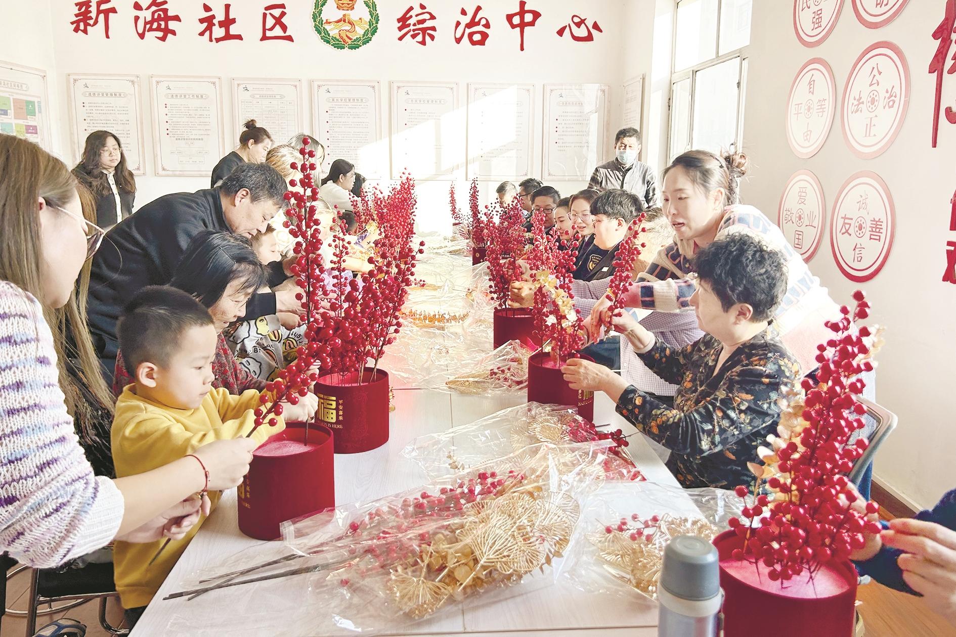 为弘扬中华优秀传统文化,进一步丰富辖区居民精神文化生活,积极营造浓厚的节日氛围,近日,海勃湾区新华街道新海社区开展了“我们的节日·春节”抱福桶制作活动。活动中,志愿者讲解了抱福桶的历史由来、制作方法等内容,家长和孩子们利用已有的材料,发挥想象力,制作出各式各样的抱福桶,现场氛围十分热闹融洽。(黄建飞 摄)