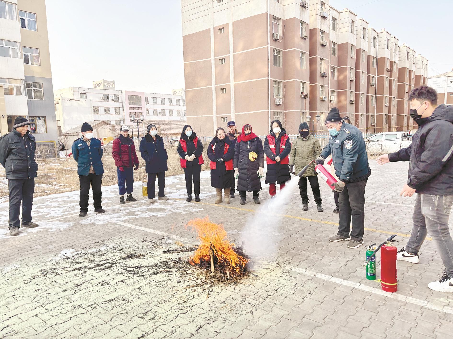 2月1日,海勃湾区海北街道青山社区联合明庆物业公司开展“以‘演’助防 以‘练’为战”消防演练活动。工作人员向居民讲解防火灭火相关知识及消防设备使用方法,增强居民安全意识。 (曹艺 摄)