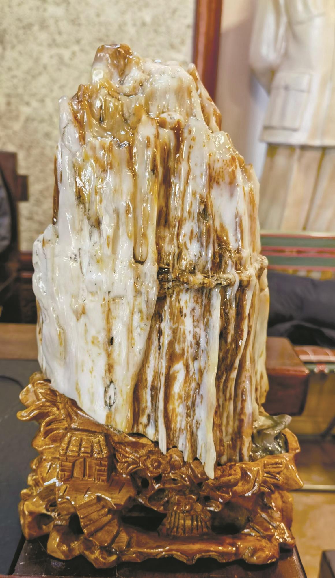 这块老皮木化玉完整,无一点缺损,是20年前的藏品,本色和水头稳定,不用专门养护,不会再褪色和失水。