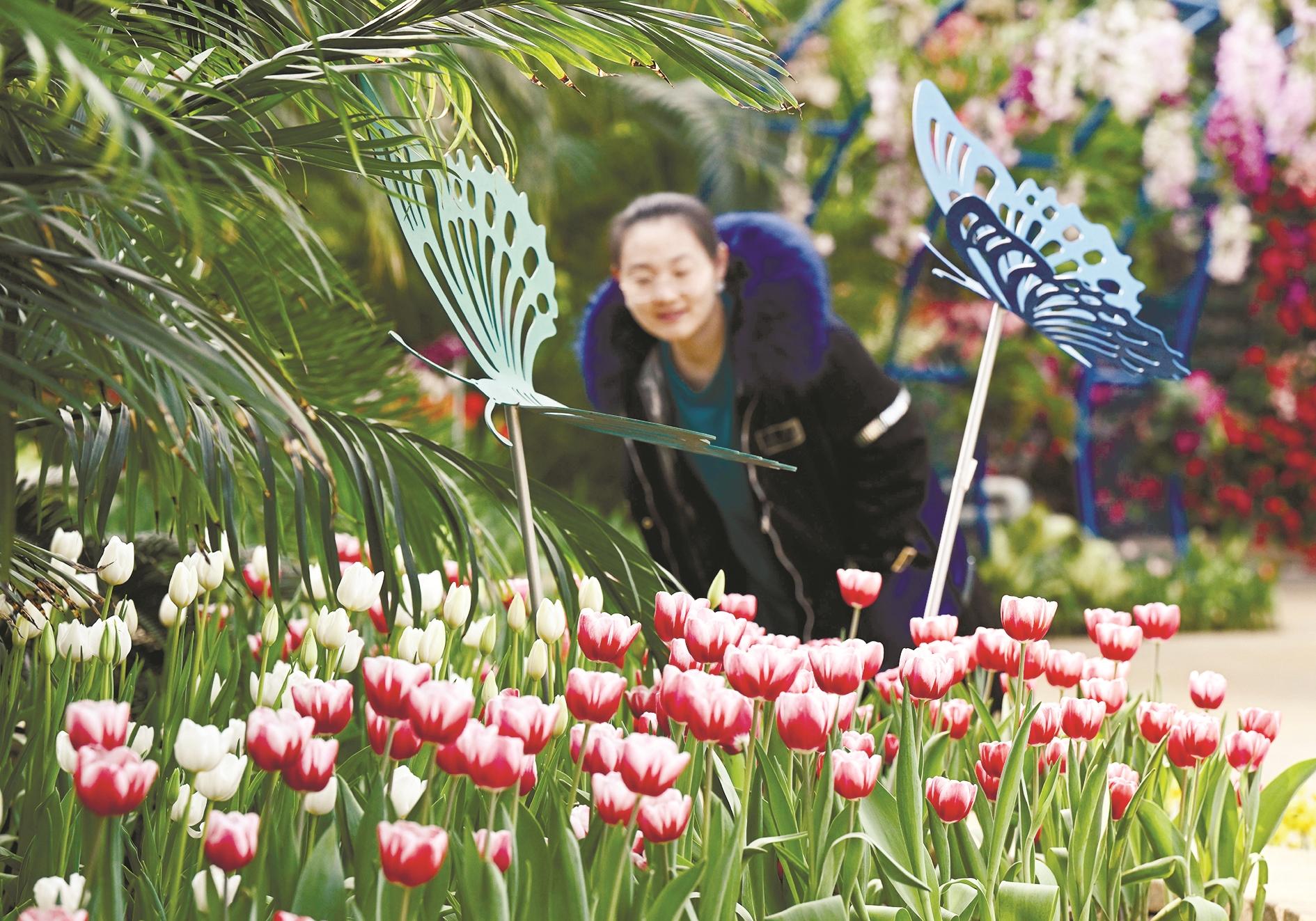2月7日,市民在河北省石家庄市植物园新春花展上赏花。春节临近,河北省石家庄市植物园举办新春花展,展出郁金香、兰花、梅花、杜鹃等百余种花卉,让游客感受到盎然春意和浓浓年味。 新华社发(陈其保 摄)