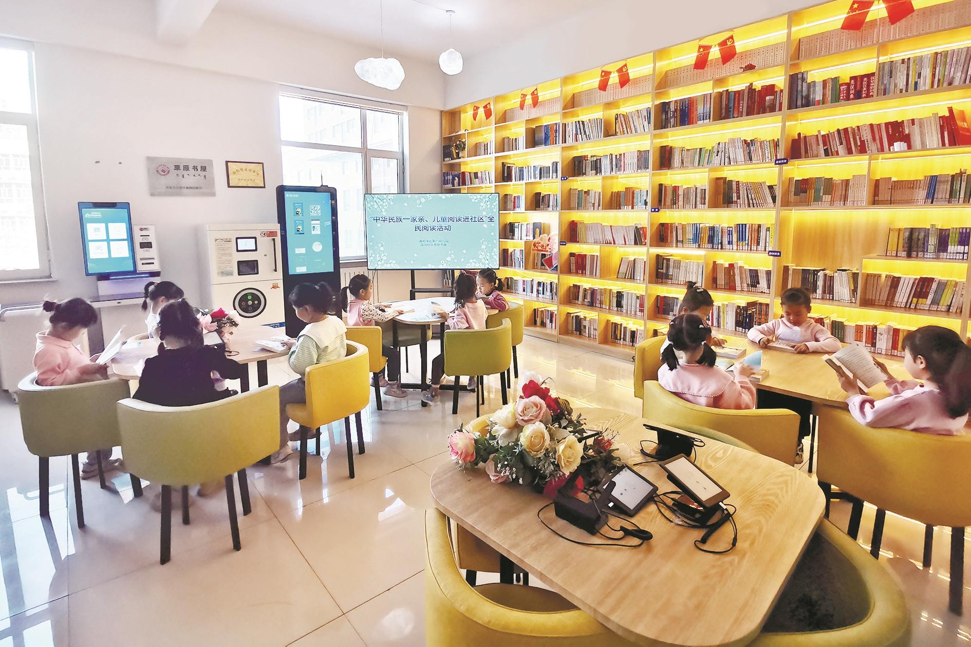 为营造爱读书、读好书、善读书的浓厚氛围,近日,海勃湾区滨河街道滨河社区开展了“中华民族一家亲 儿童阅读进社区”全民阅读活动。活动中,辖区儿童在草原书屋挑选自己喜欢的书籍阅读,并向大家分享书籍内容和读书体会。 (黄建飞 摄)