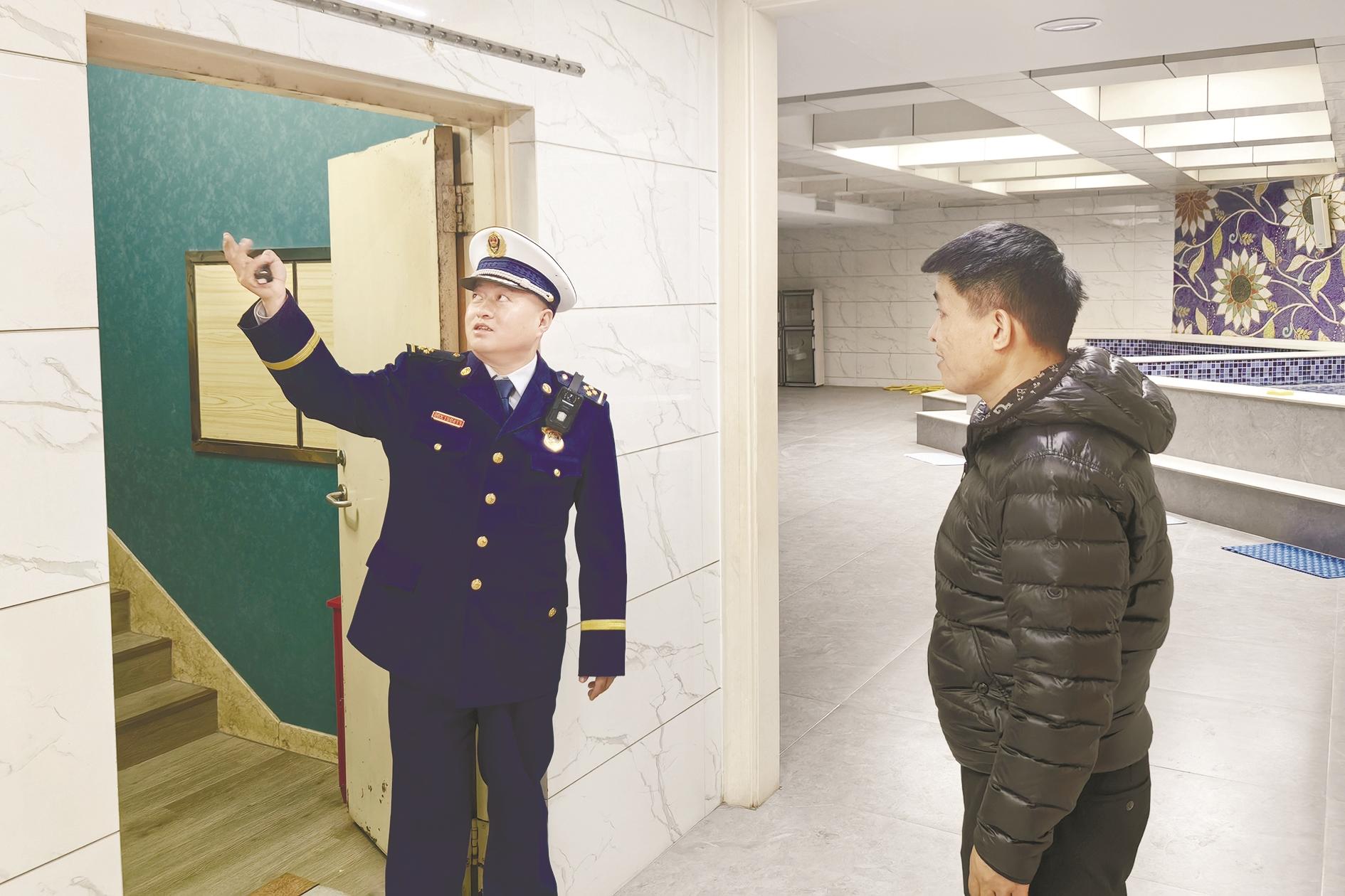 近日,市消防救援支队开展了春节消防安全检查。工作人员到辖区桑拿洗浴场所、网吧、游泳馆等人员密集场所重点检查了疏散通道是否保持畅通、消防设施及灭火器材是否完整好用、是否常态化开展从业人员安全教育培训、防火巡查检查制度是否落实到位等情况。通过检查,及时消除火灾隐患,确保我市火灾形势持续稳定。(黄建飞 摄)