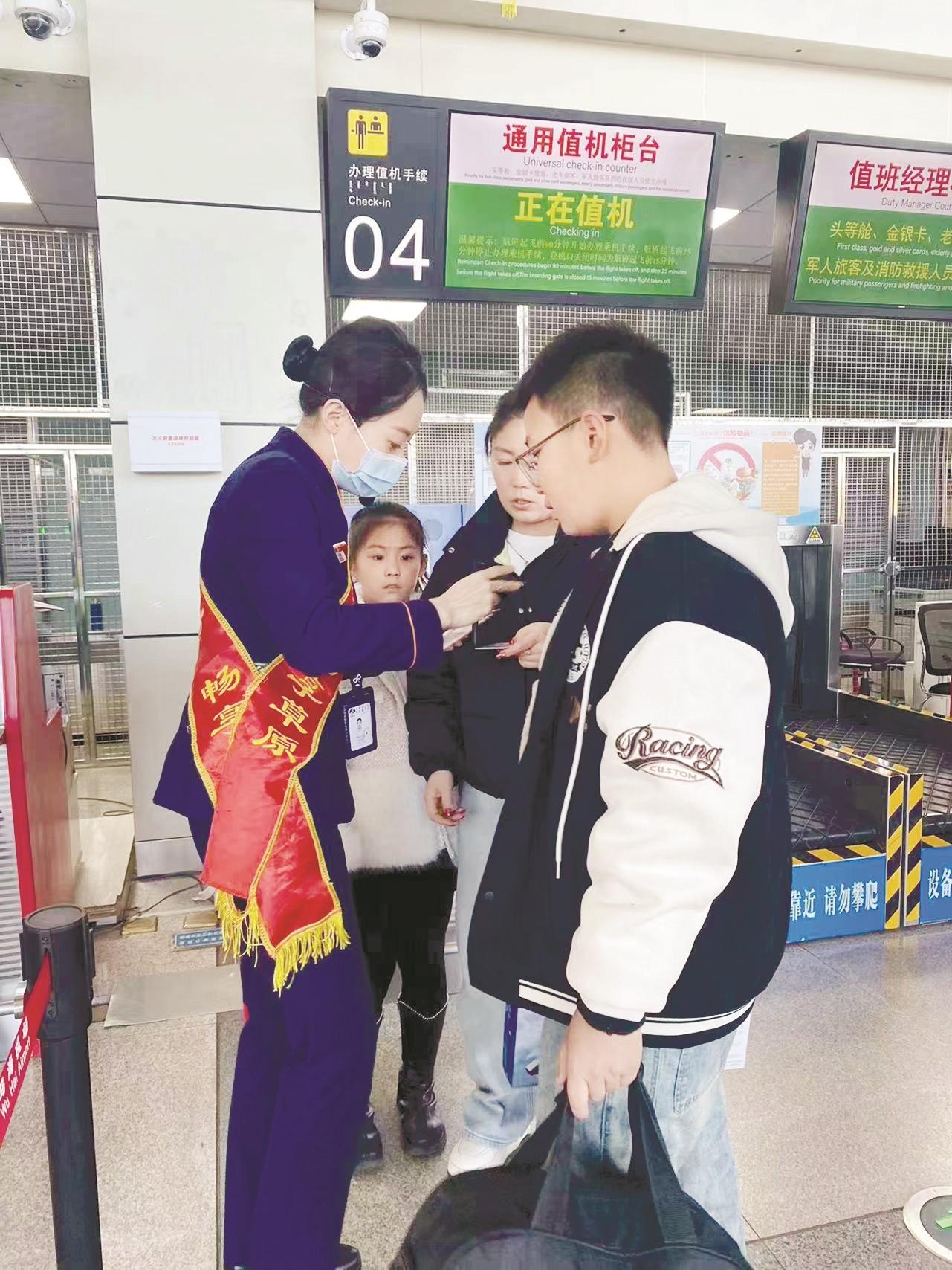机场工作人员为旅客提供服务。 (张楚研 摄)