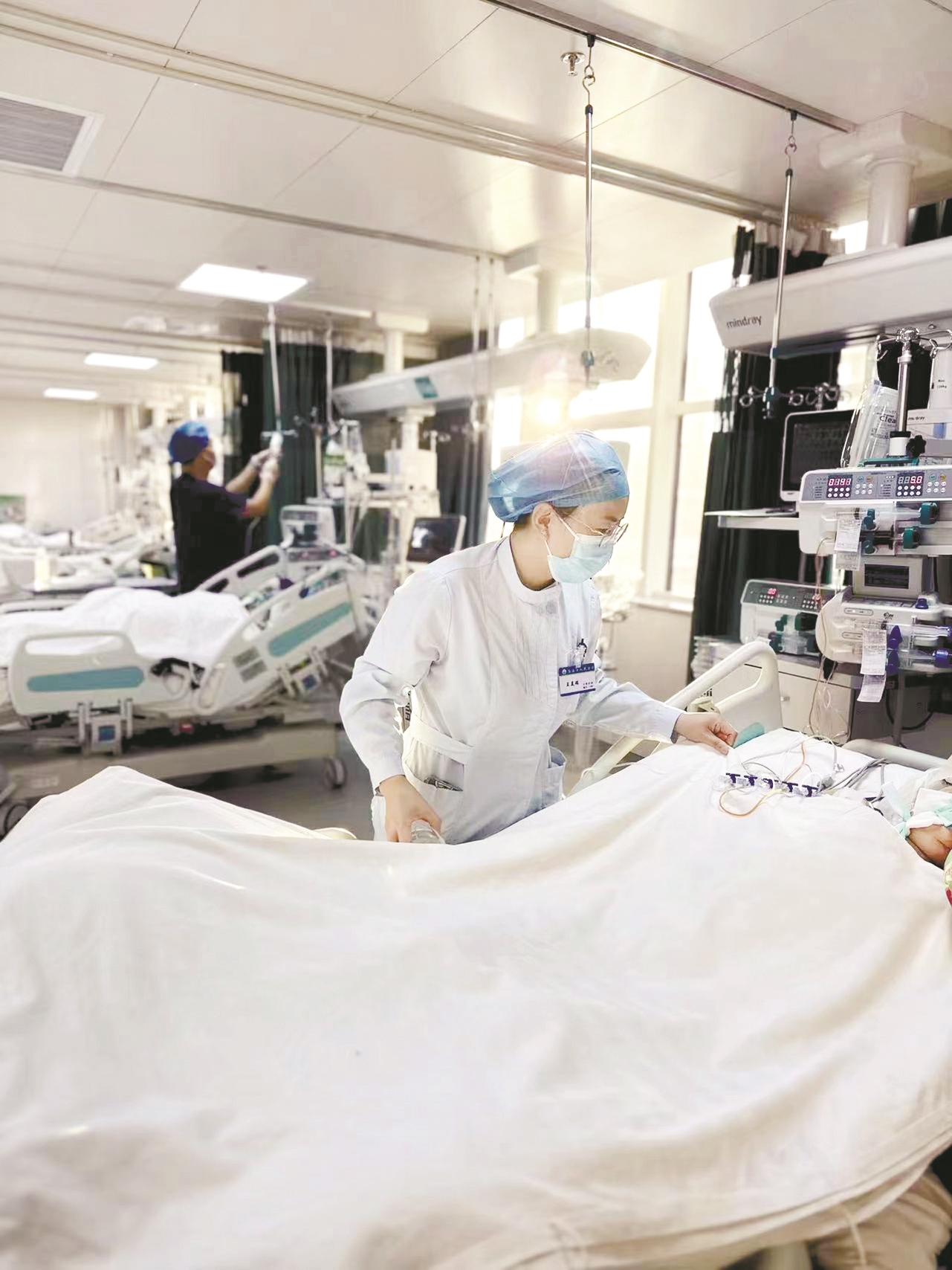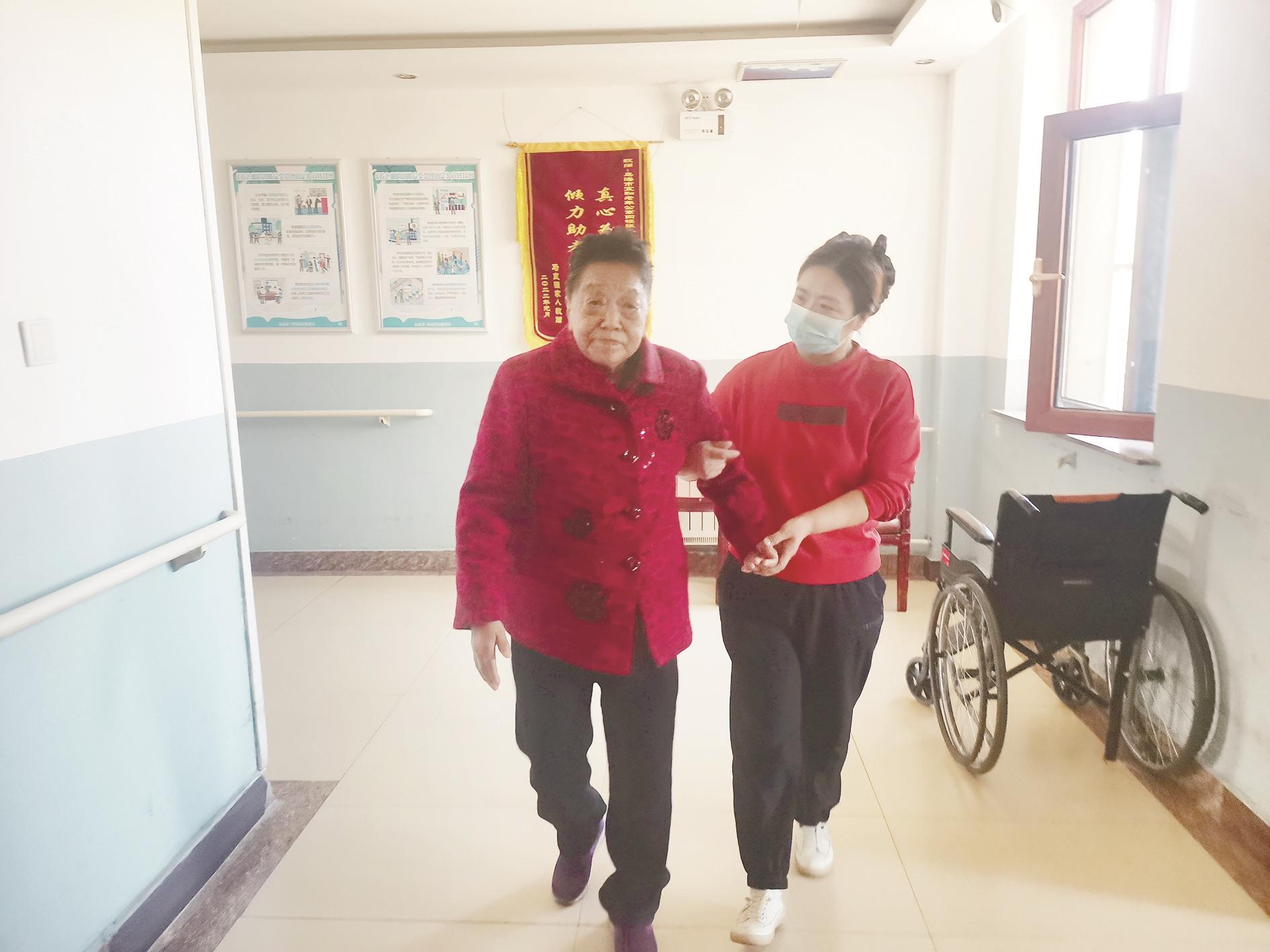 养老护理员陪伴在老人身边。 (张楚研 摄)