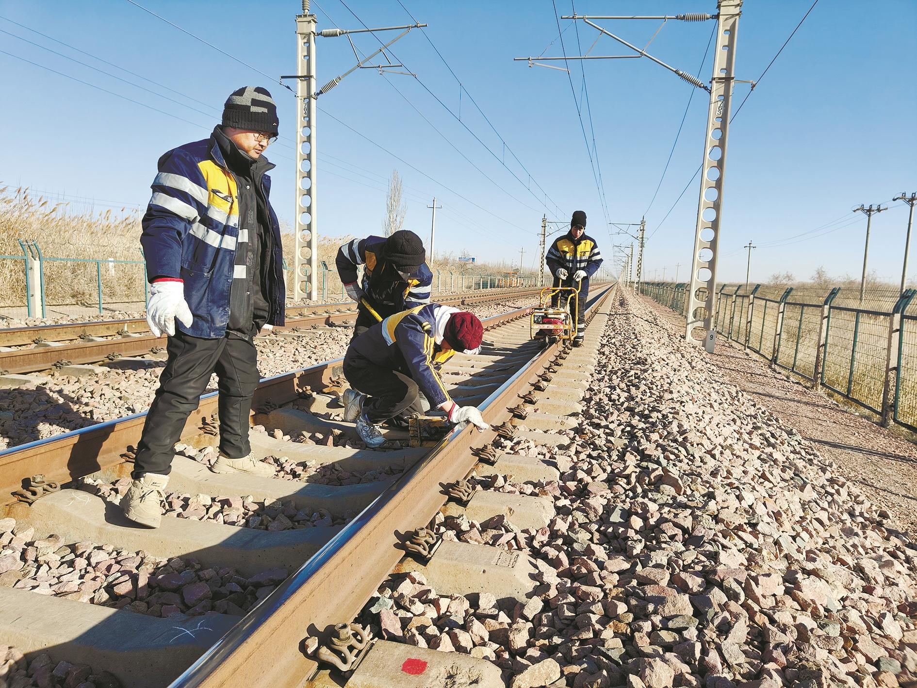 乌海工务段工人检修铁轨。 (张楚研 摄)