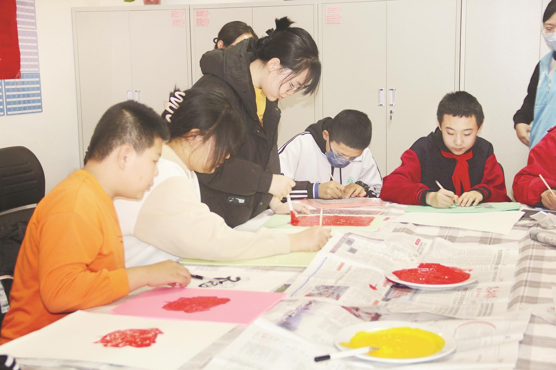 近日,新华西街道滨水社区开展了“我们的节日——春节实践活动”。图为学生制作拓印画。 (陈洋 摄)