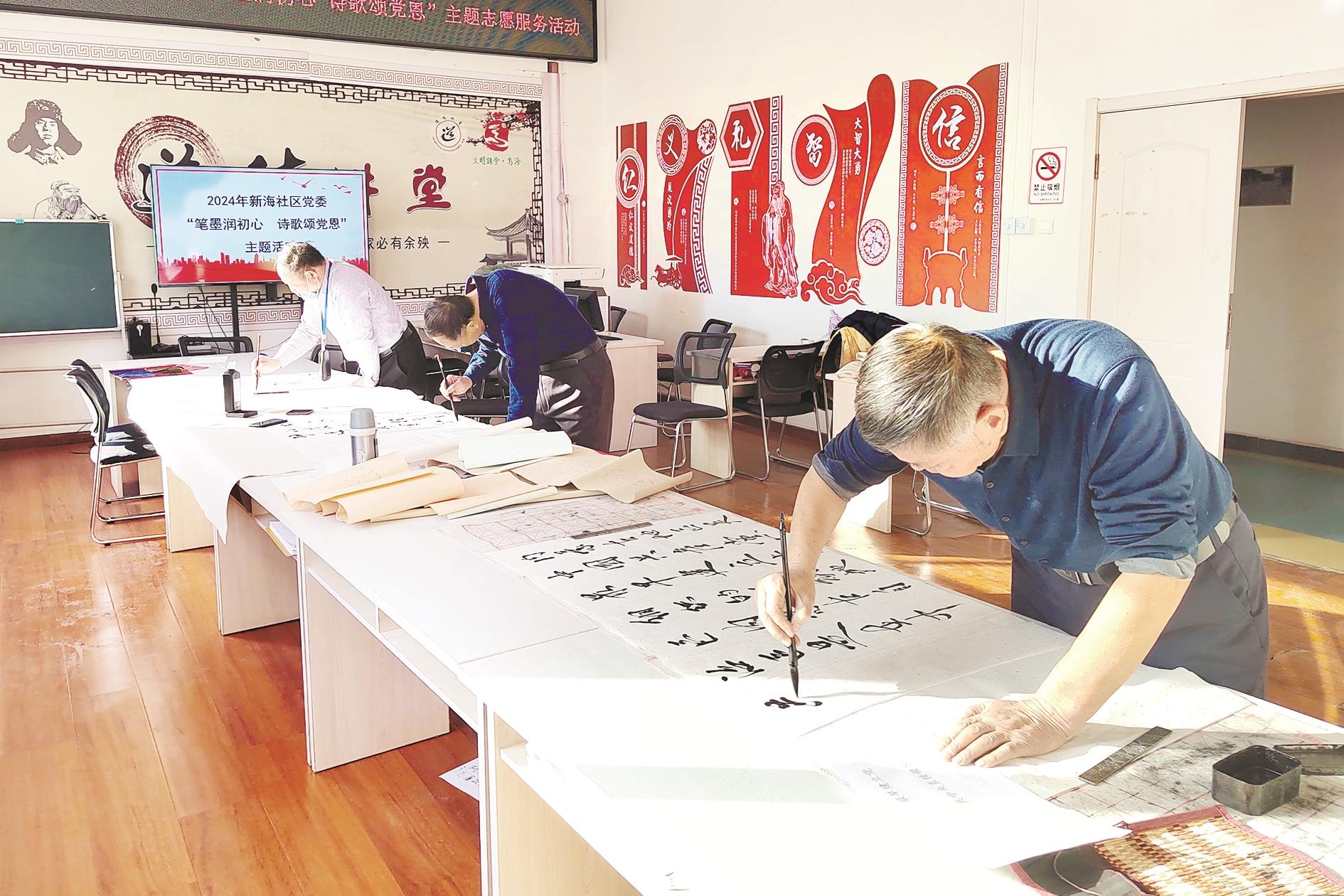 近日,海勃湾区新华街道新海社区党委开展了“笔墨润初心 诗歌颂党恩”书法进社区活动。活动中,辖区党员、书法爱好者一同写书法,表达对党和国家的歌颂之情和美好的祝福。