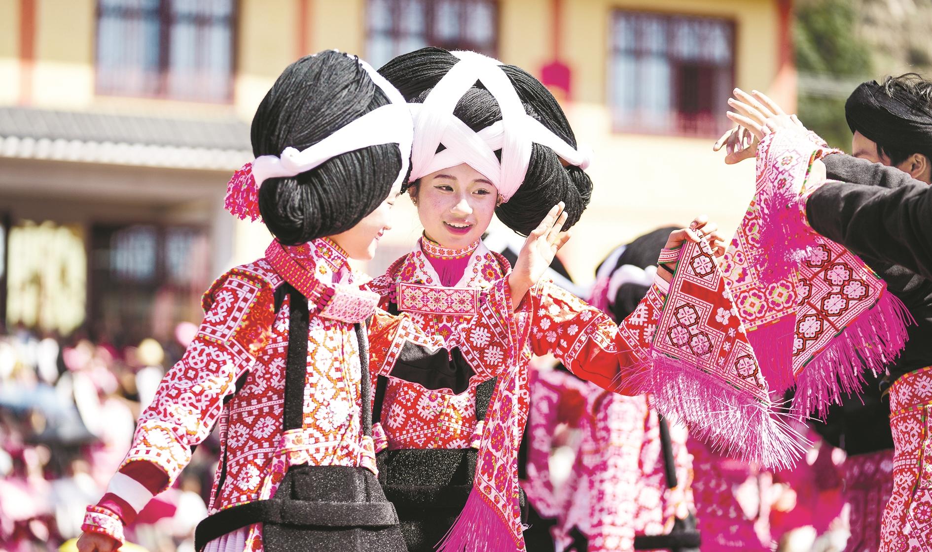 2月19日,苗族群众在六枝特区梭戛苗族彝族回族乡高兴村跳花场表演舞蹈。当日是农历正月初十,贵州省六盘水市六枝特区梭戛苗族彝族回族乡苗族跳花节在高兴村跳花场举办。来自周边地区的苗族群众及国内外游客上万人汇聚花场,欢度跳花节。跳花节期间还将举行苗族打鼓、苗族三眼萧、芦笙舞和苗族山歌对唱等活动。