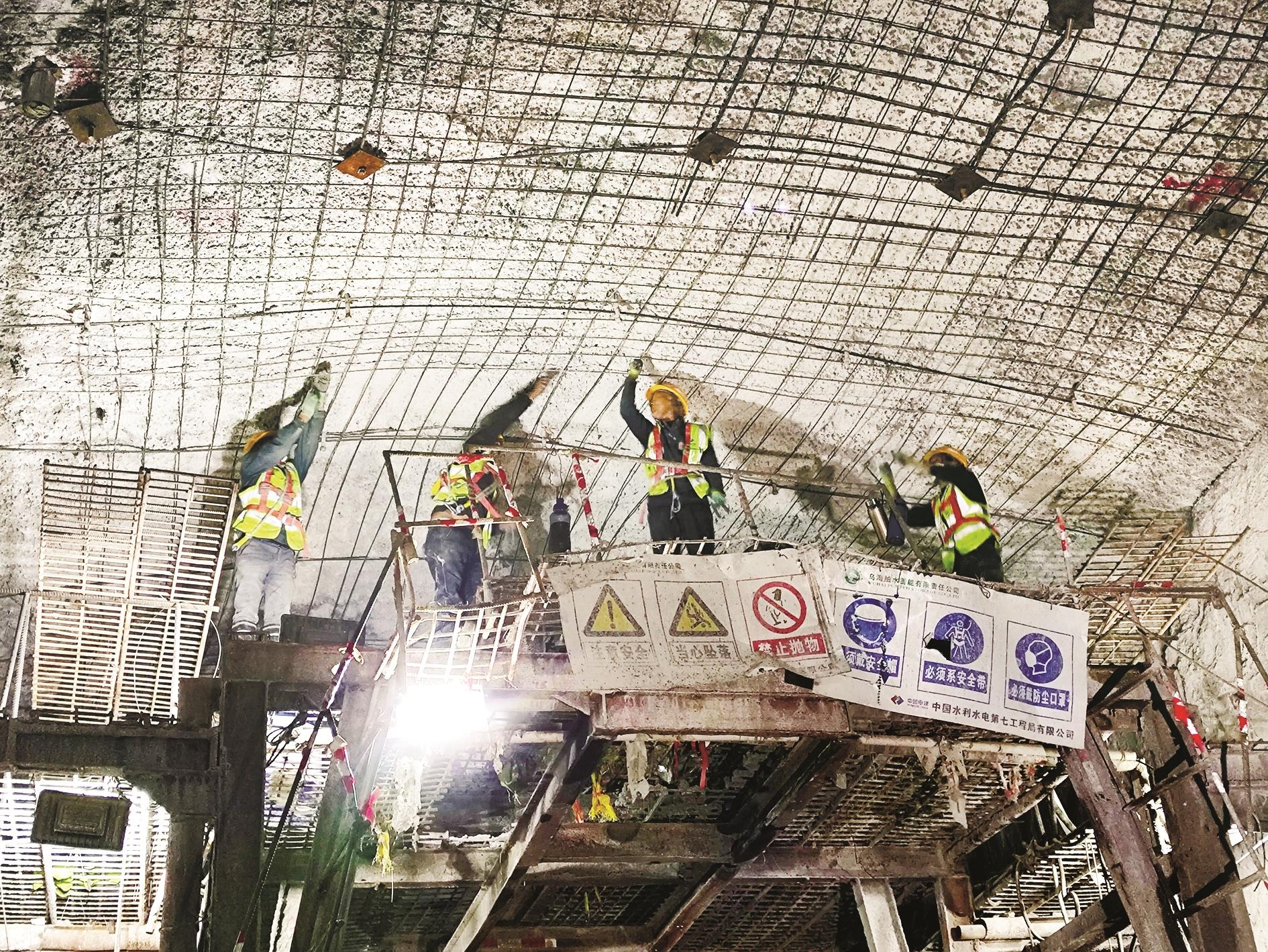 在乌海抽水蓄能电站项目地下厂房工程施工现场,施工人员在安装固定顶拱钢筋网片。(黄建飞 摄)