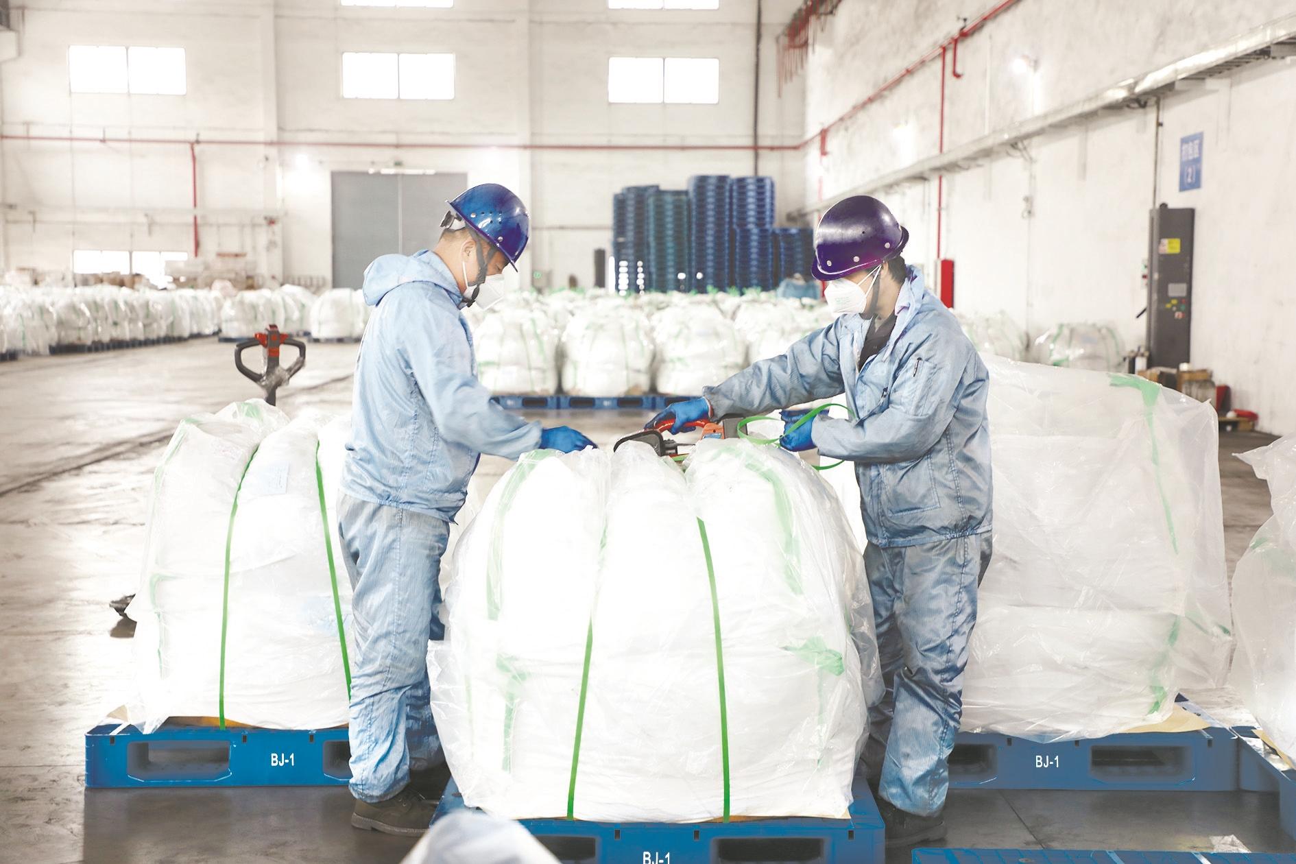 乌海宝杰新能源材料有限公司生产车间,工人正忙着打包产品。 (高瑞鹏 摄)