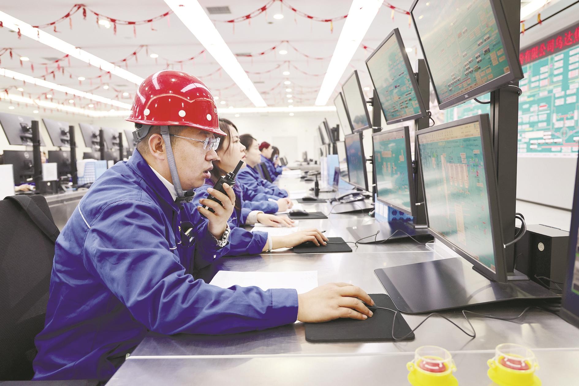 在内蒙古君正化工有限责任公司中控室,工作人员指挥调度各车间的设备运转情况。 (高瑞鹏 摄)