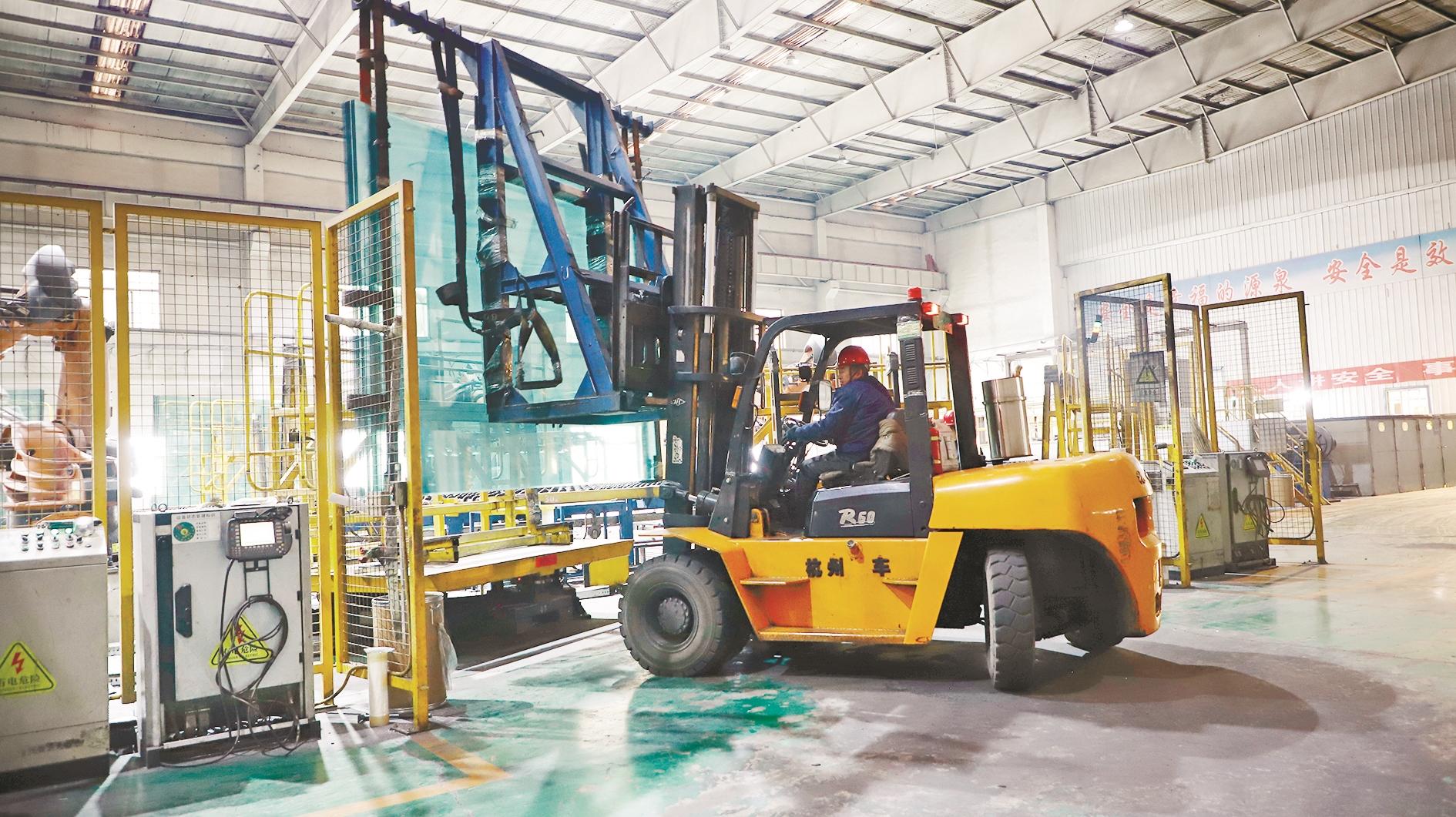 乌海中玻特种玻璃有限责任公司玻璃生产车间内,工人用叉车搬运玻璃成品。 (赵政宇 摄)