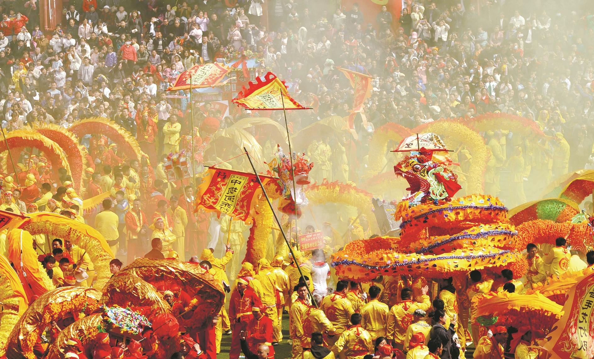 2月20日,人们在贵州省铜仁市石阡县体育场参加舞毛龙展演。元宵佳节临近,人们进行传统舞龙表演,热热闹闹迎元宵。