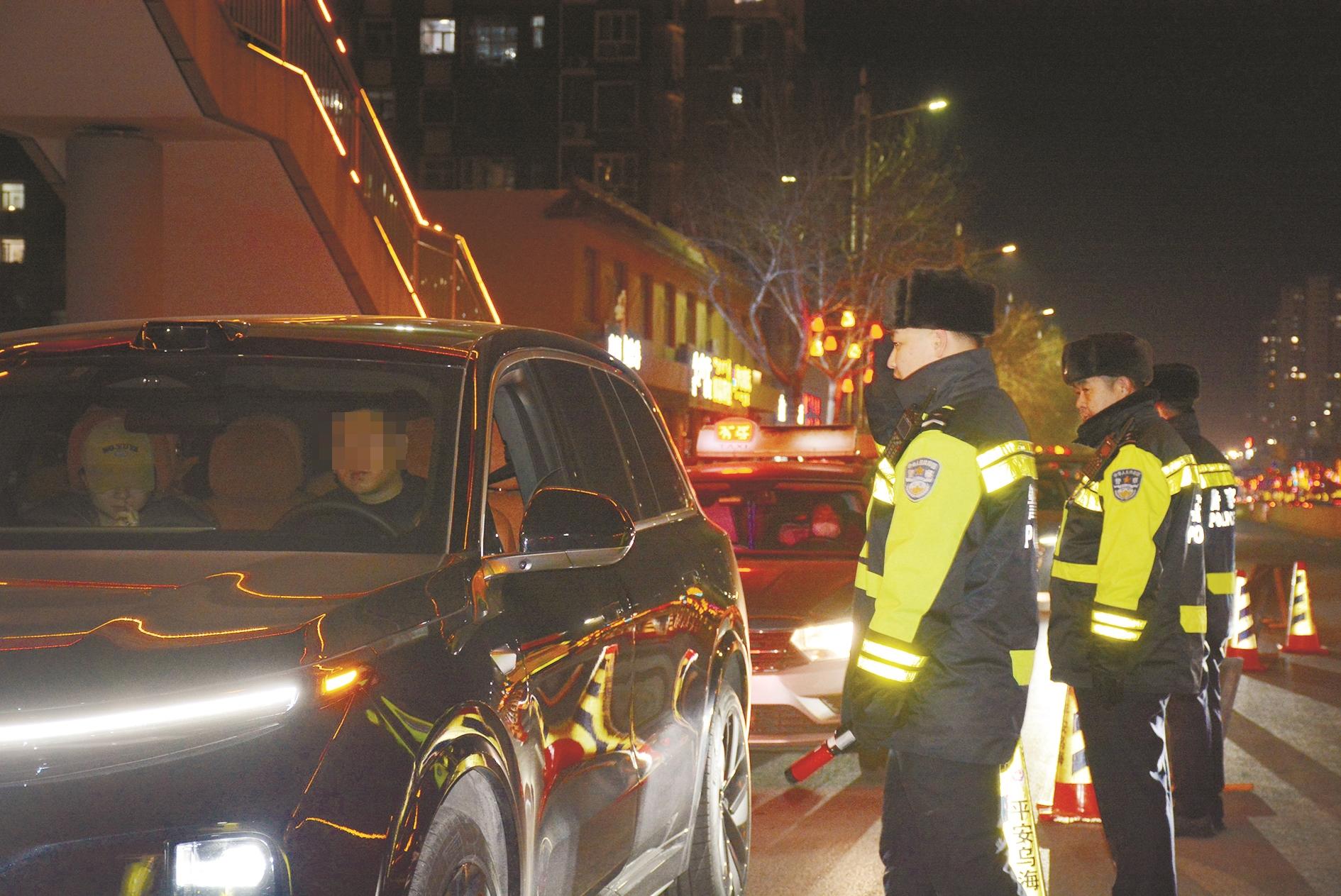市公安局交管支队针对春运期间复杂的道路交通情况,持续加大重点时段、重点路段、人流车流密集路段的巡逻管控,依法严厉查处车辆超员、疲劳驾驶、酒驾醉驾、无牌无证等交通违法行为,并开展交通安全宣传,切实保障节日期间全市道路交通安全畅通有序。图为民警进行夜查。 (曹艺 摄)