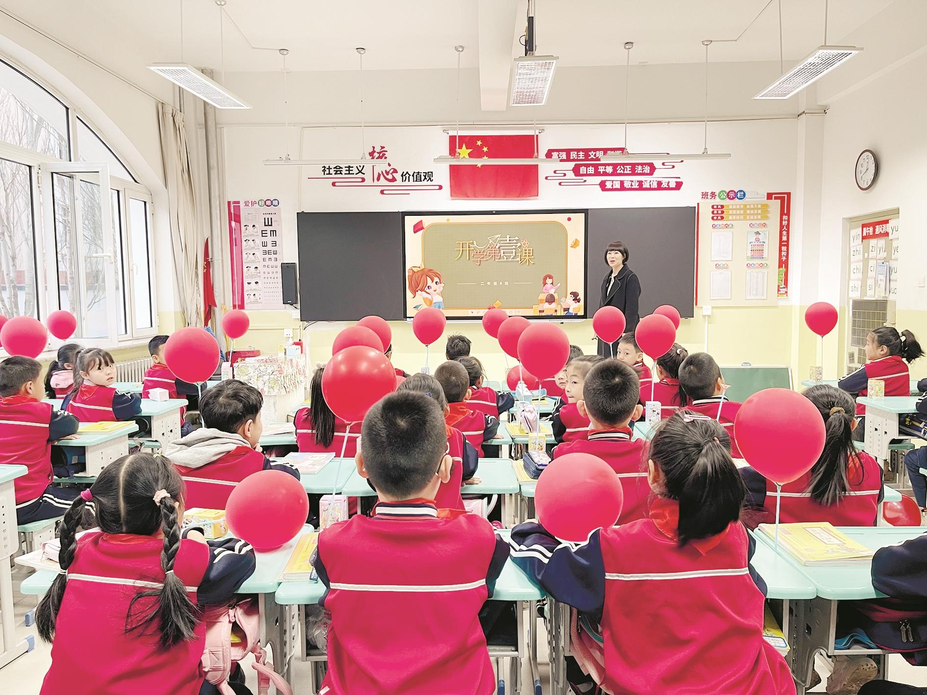 海南区第三小学的学生们也准时进入校园,通过一扇“新学期新梦想”的红色大门后,开启了元气满满的校园生活。在五年级1班,一堂以“安全教育”为主题的开学第一课正在进行,教师从校园安全、交通安全等多个方面结合实例,引导学生增强安全意识,将安全第一的理念根植于心。