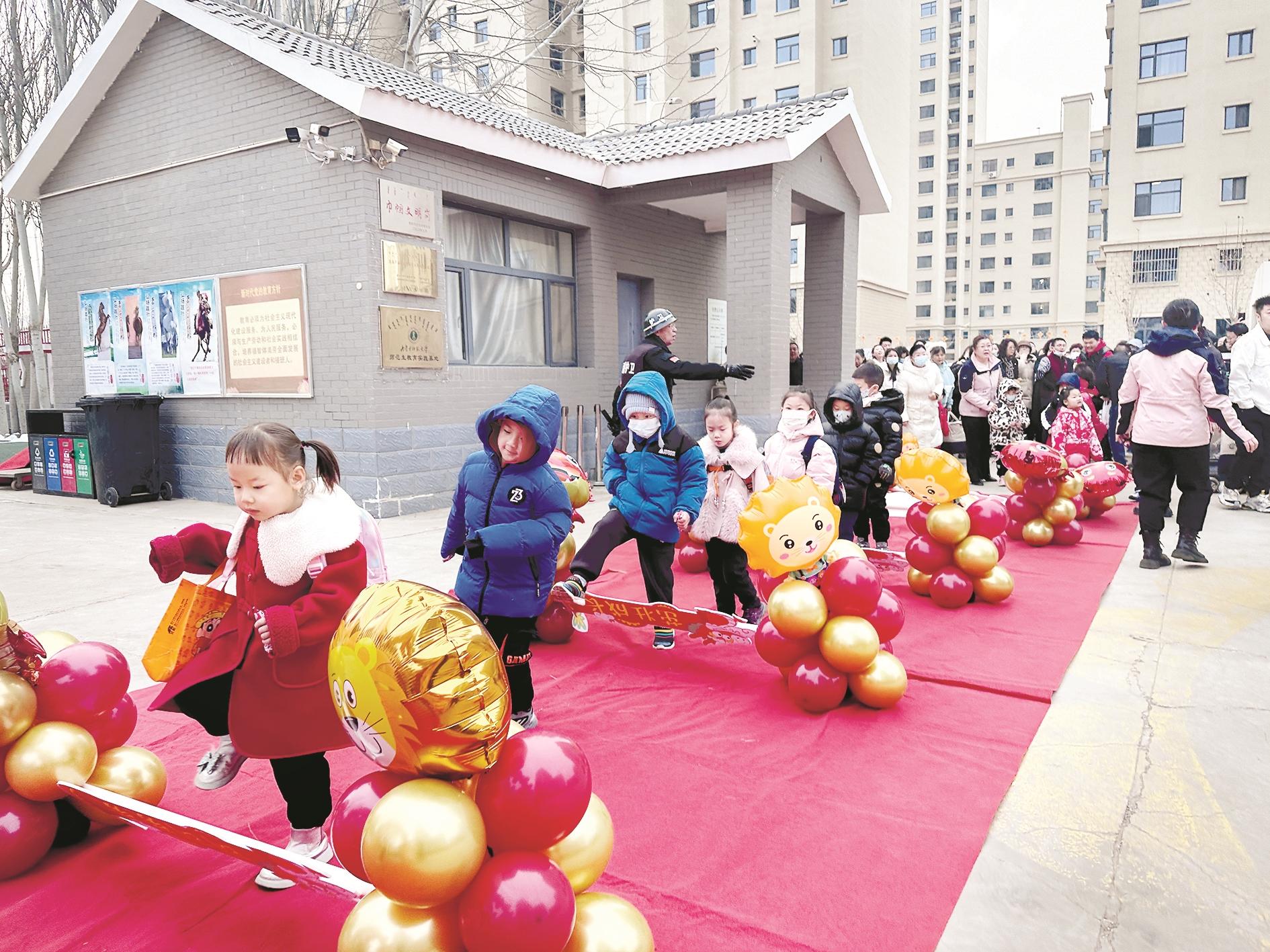 海勃湾区第八幼儿园的孩子们跨过跨板,穿过气球拱门,迈向新学期。 (王蒙 摄)