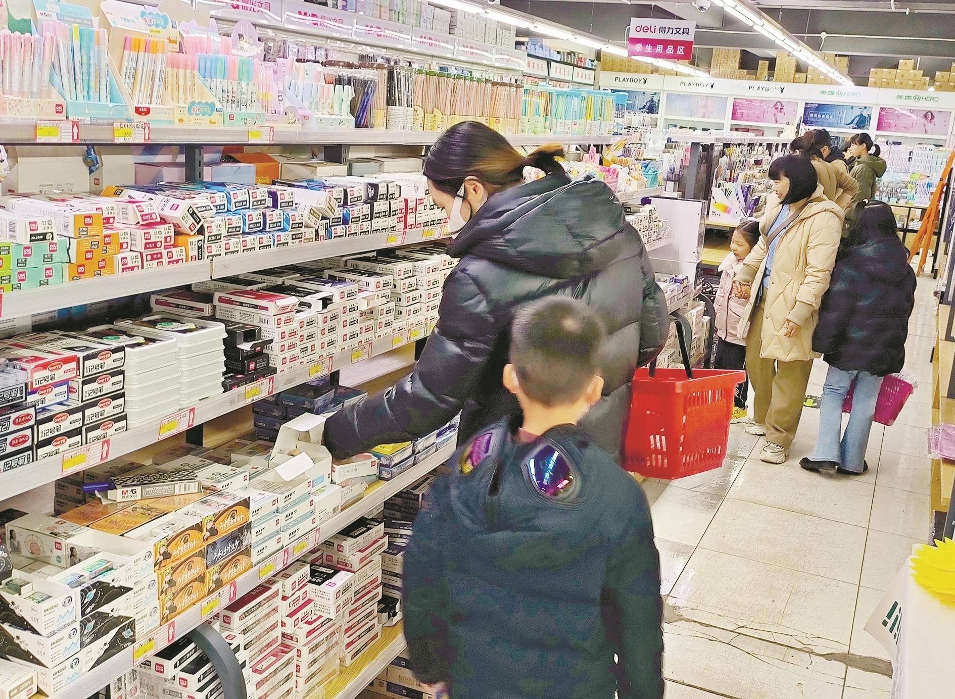 随着我市中小学迎来开学季,书皮、练习本、铅笔、书包等文具用品热销。图为2月25日,家长带学生在文具店选购文具。 (路静 摄)