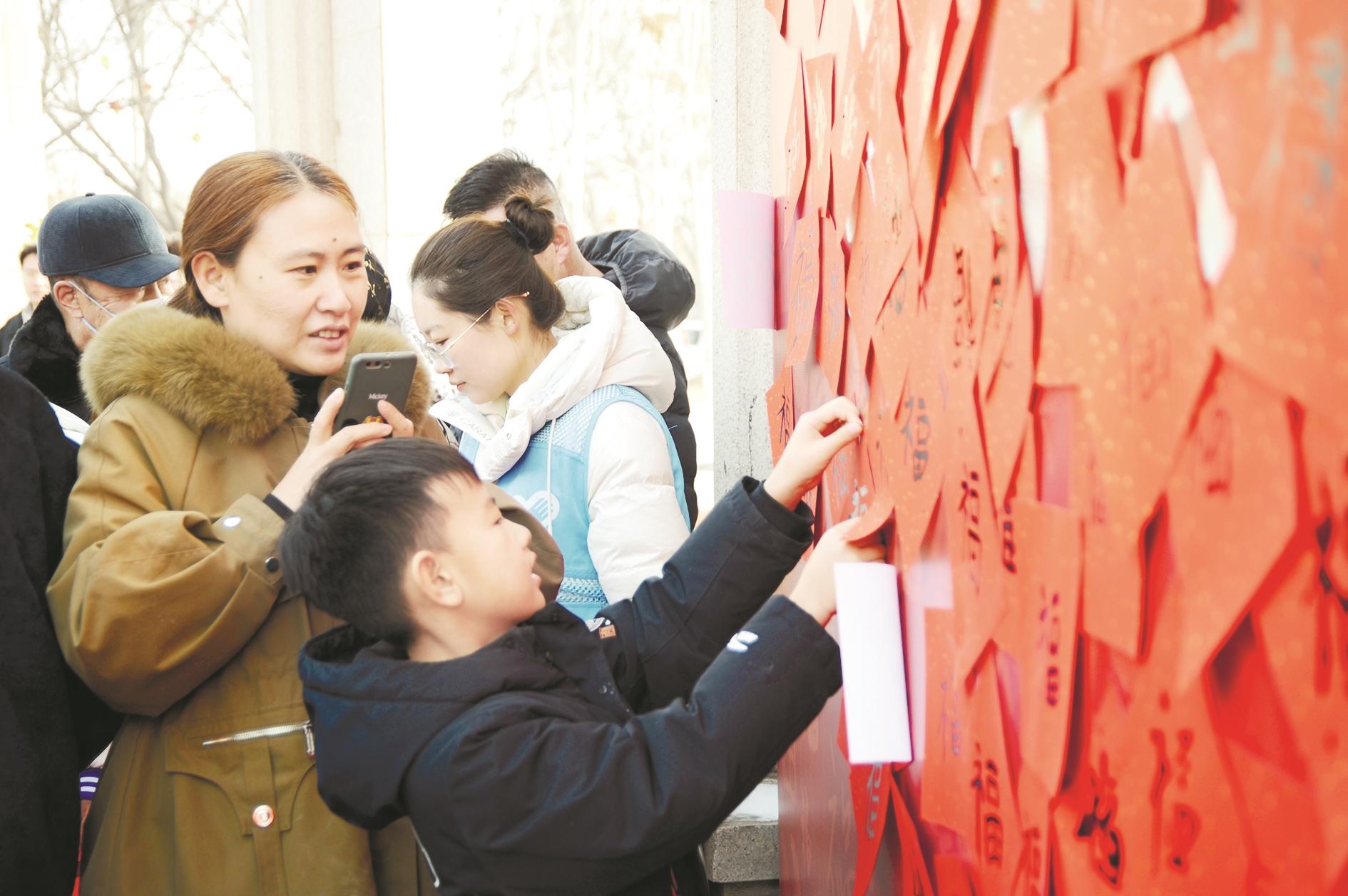市民将自己写好的“福”字贴在百福墙上。(郑彩虹 摄)
