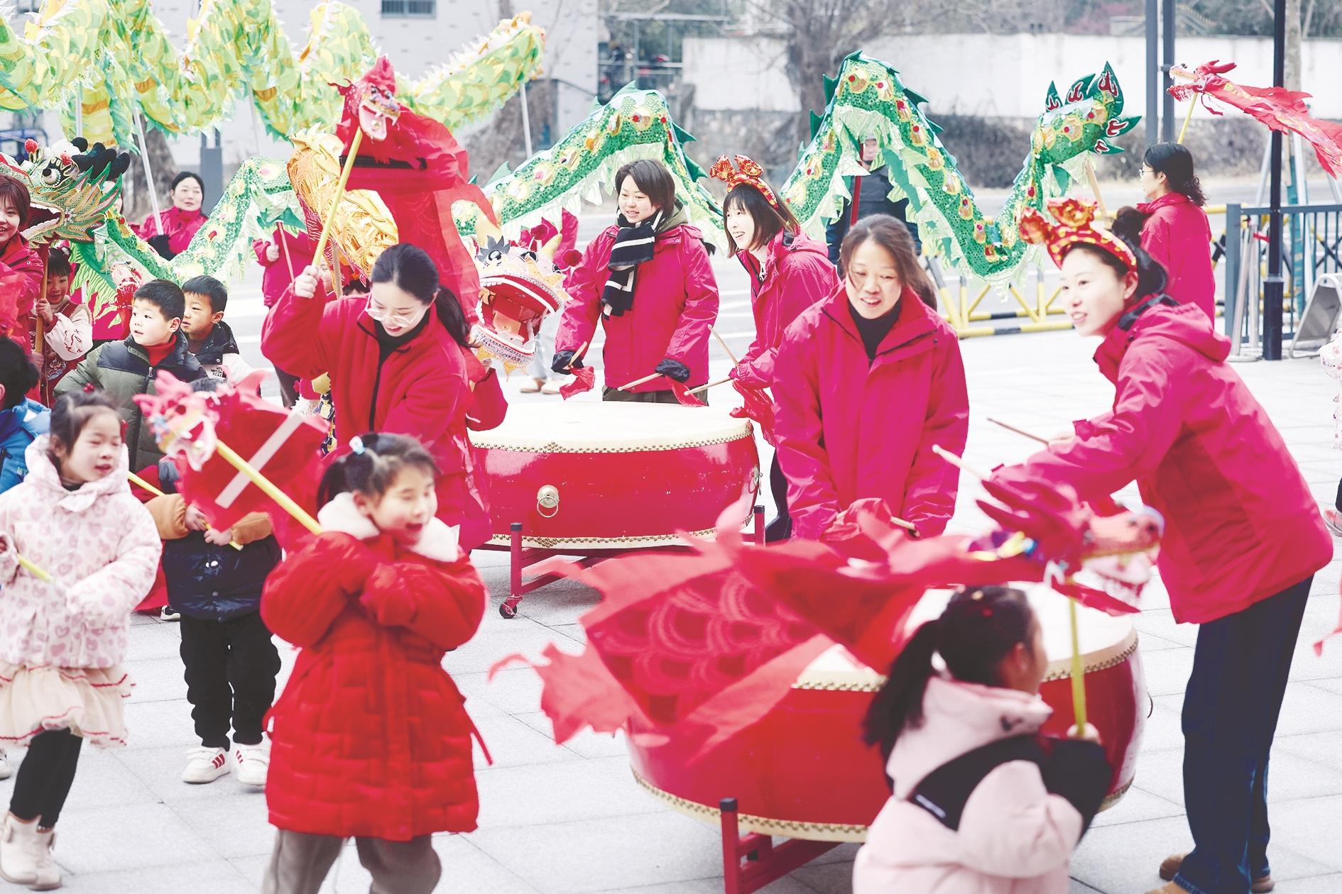 2月25日,李家巷镇中心幼儿园的孩子们在老师带领下体验舞龙。当日,浙江省湖州市长兴县李家巷镇中心幼儿园开展“趣探非遗 喜迎开学”开学第一课主题活动。孩子们在老师的带领下,学习与龙年相关的中国传统文化知识,体验舞龙、剪纸、做灯笼,近距离感受非遗传统文化的独特魅力。 新华社记者 徐昱 摄