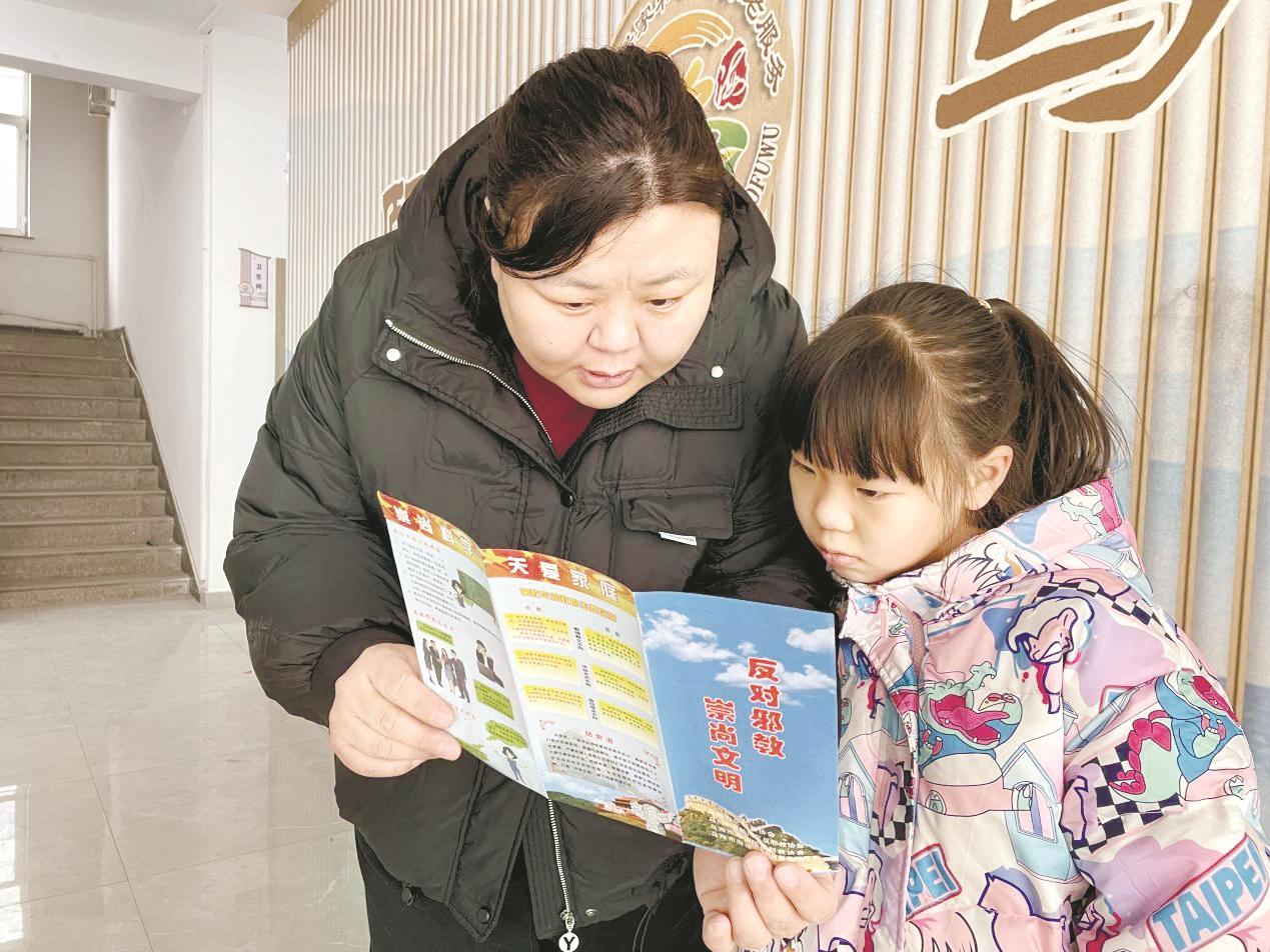 近日,海勃湾区林荫街道大庆社区新时代文明实践站开展“童心无邪 齐心反邪”未成年人反邪教宣传活动,通过鲜活的案例引导孩子对歪理邪说不听、不信、不传。 (毕晓敏 摄)