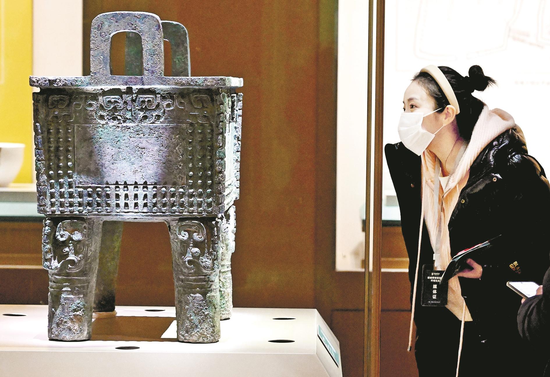 2月26日,参观者在河南安阳殷墟博物馆新馆内观看展品“司母辛”铜鼎。2月26日,位于河南省安阳市的殷墟博物馆新馆正式开馆,这是首个全景式展现商文明的国家重大专题博物馆。殷墟博物馆新馆坐落于安阳市洹河北岸,与殷墟宫殿宗庙遗址隔河相望,展厅面积约2.2万平方米,展出青铜器、陶器、玉器、甲骨等文物近4000件套。其中,四分之三以上的珍贵文物首次亮相,一系列考古新成果首次展示。
