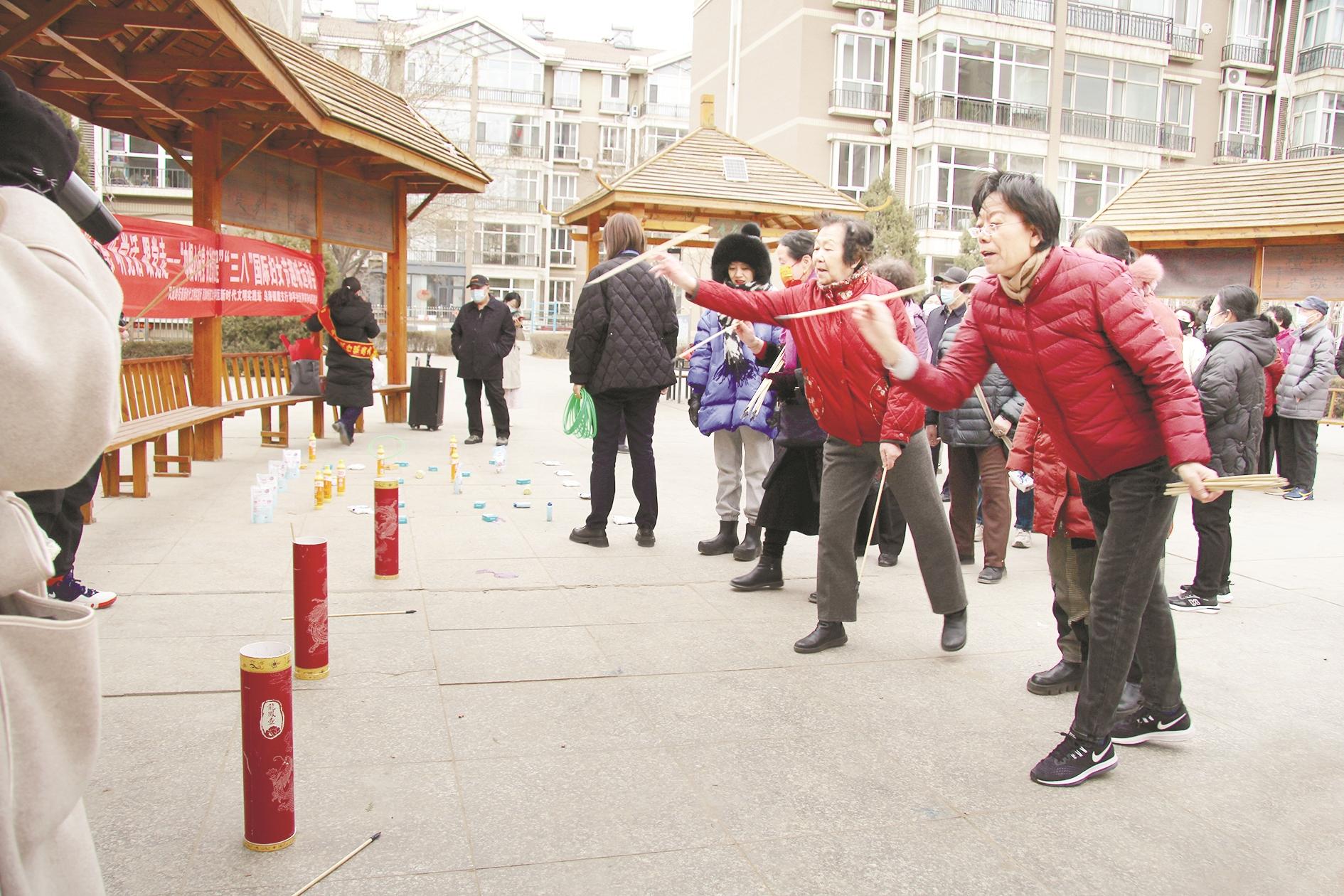 图②:海勃湾区凤凰岭街道新时代文明实践所、凤凰岭街道和平社区新时代文明实践站联合举办趣味运动会。套圈、投壶、搭积木等趣味游戏丰富了居民生活。 (张楚研 摄)