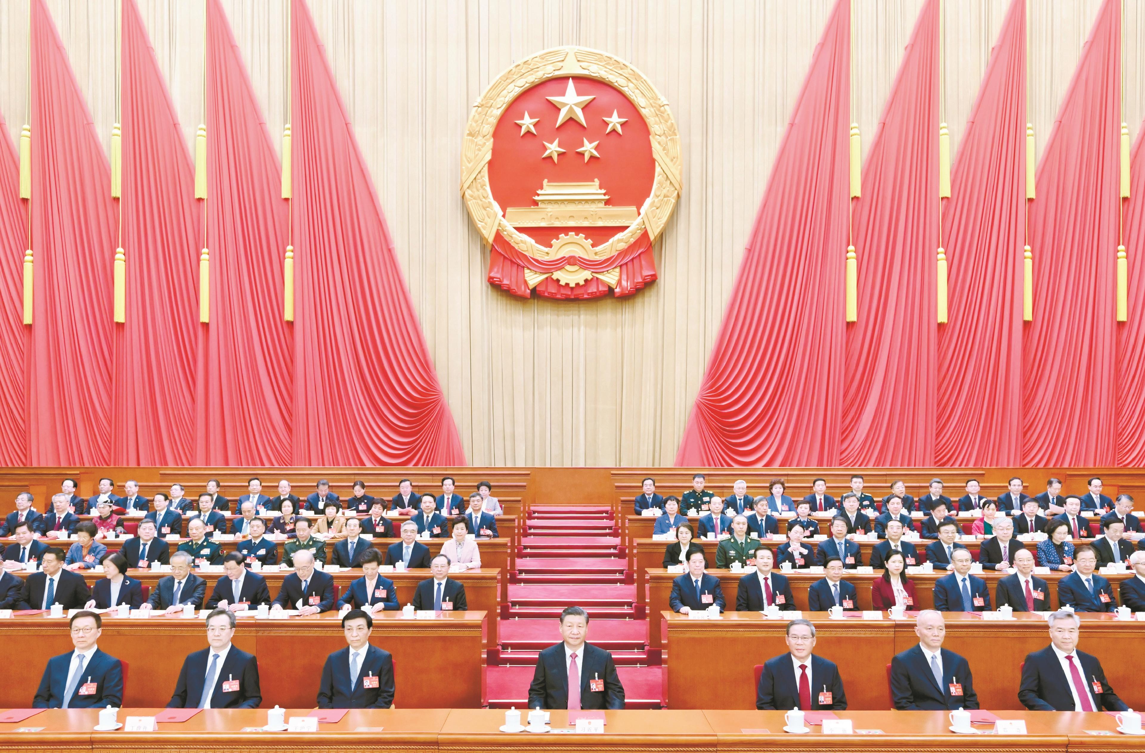 3月11日,第十四届全国人民代表大会第二次会议在北京人民大会堂闭幕。党和国家领导人习近平、李强、王沪宁、蔡奇、丁薛祥、李希、韩正等在主席台就座。 新华社记者 谢环驰 摄