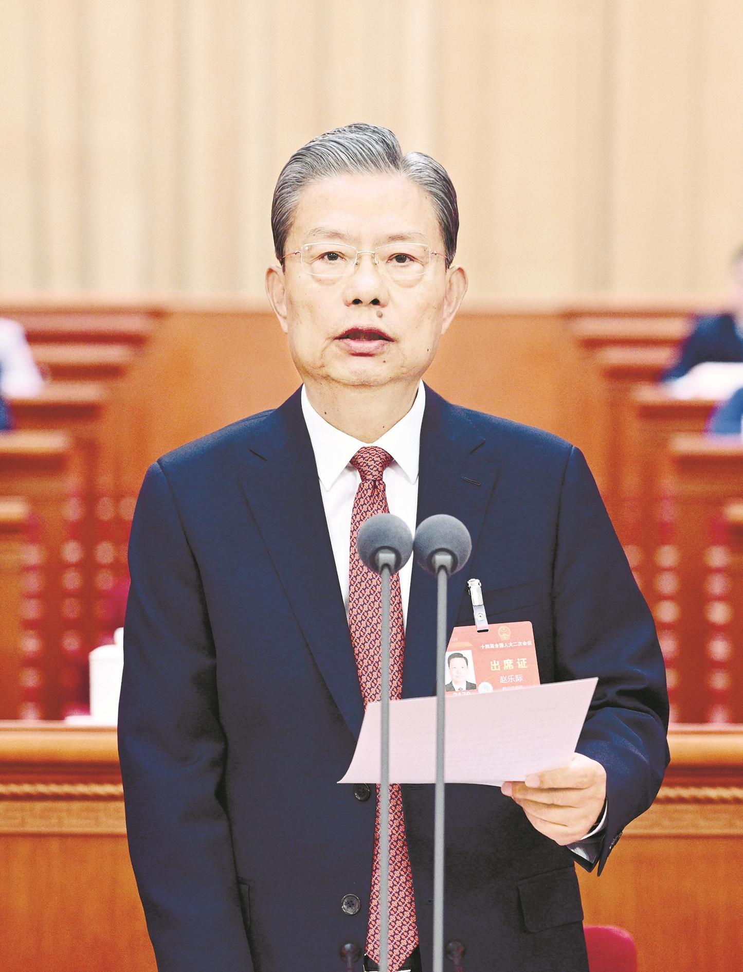 3月11日,第十四届全国人民代表大会第二次会议在北京人民大会堂举行闭幕会。大会主席团常务主席、执行主席赵乐际主持闭幕会并讲话。 新华社记者 李学仁 摄
