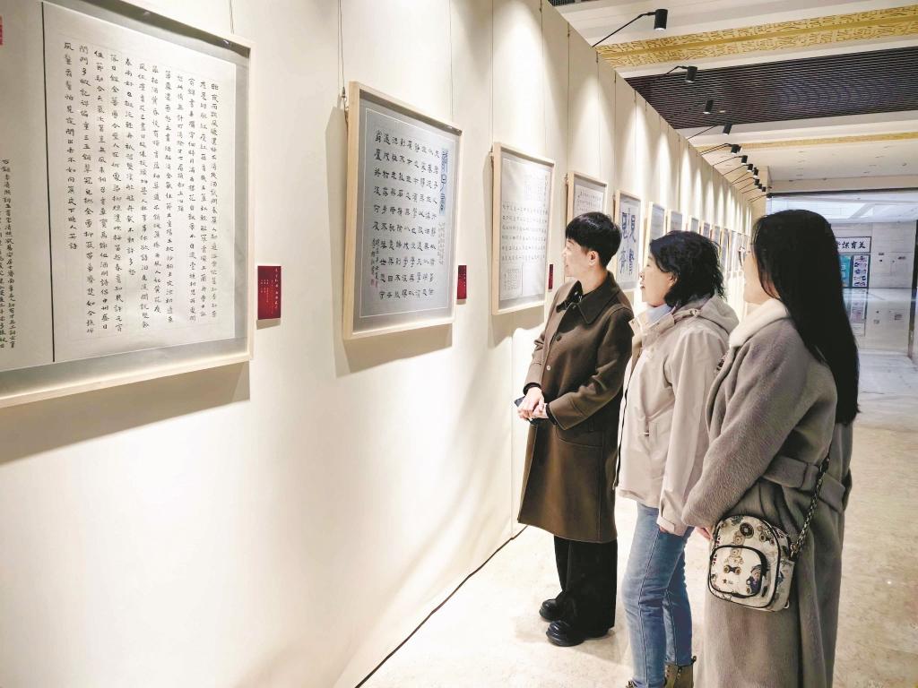 3月8日,由市文联主办,市书法家协会女子书法家分会协办的“艺韵北疆 巾帼墨香”乌海市女子书法展在当代中国书法艺术馆开展,展示了我市女子书家的艺术才情与风采。图为书法爱好者观看展览。 (张靖爽 摄)