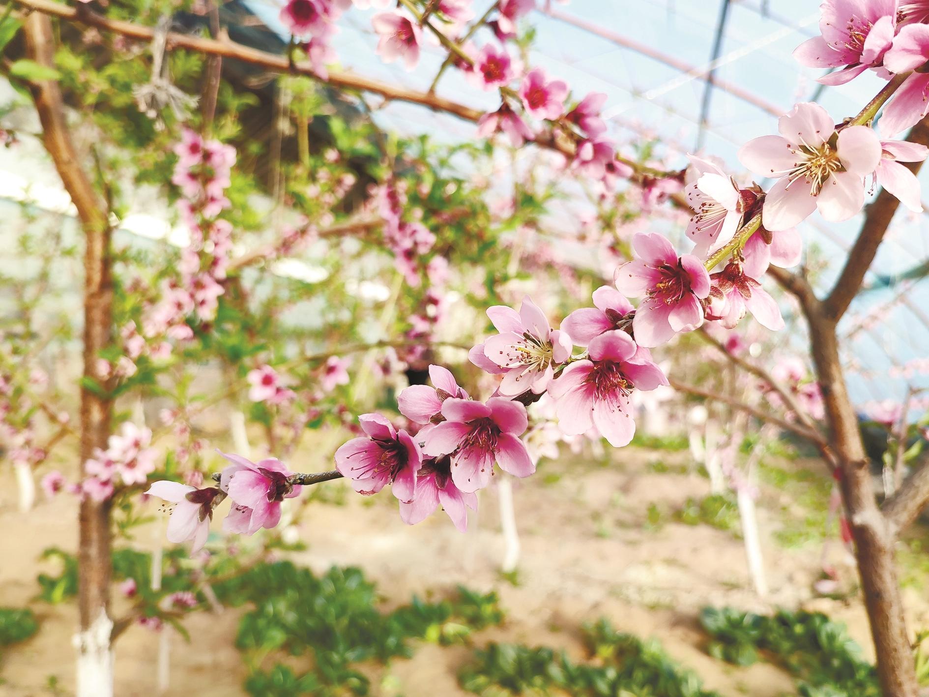 初春时节,户外春寒料峭,温室大棚内却温暖迎春。我市温室大棚种植的桃树、樱桃树等经济树种迎来盛花期,开始孕育新一轮增收的果实。图为桃花缀满枝头喜迎春。 (路静 摄)