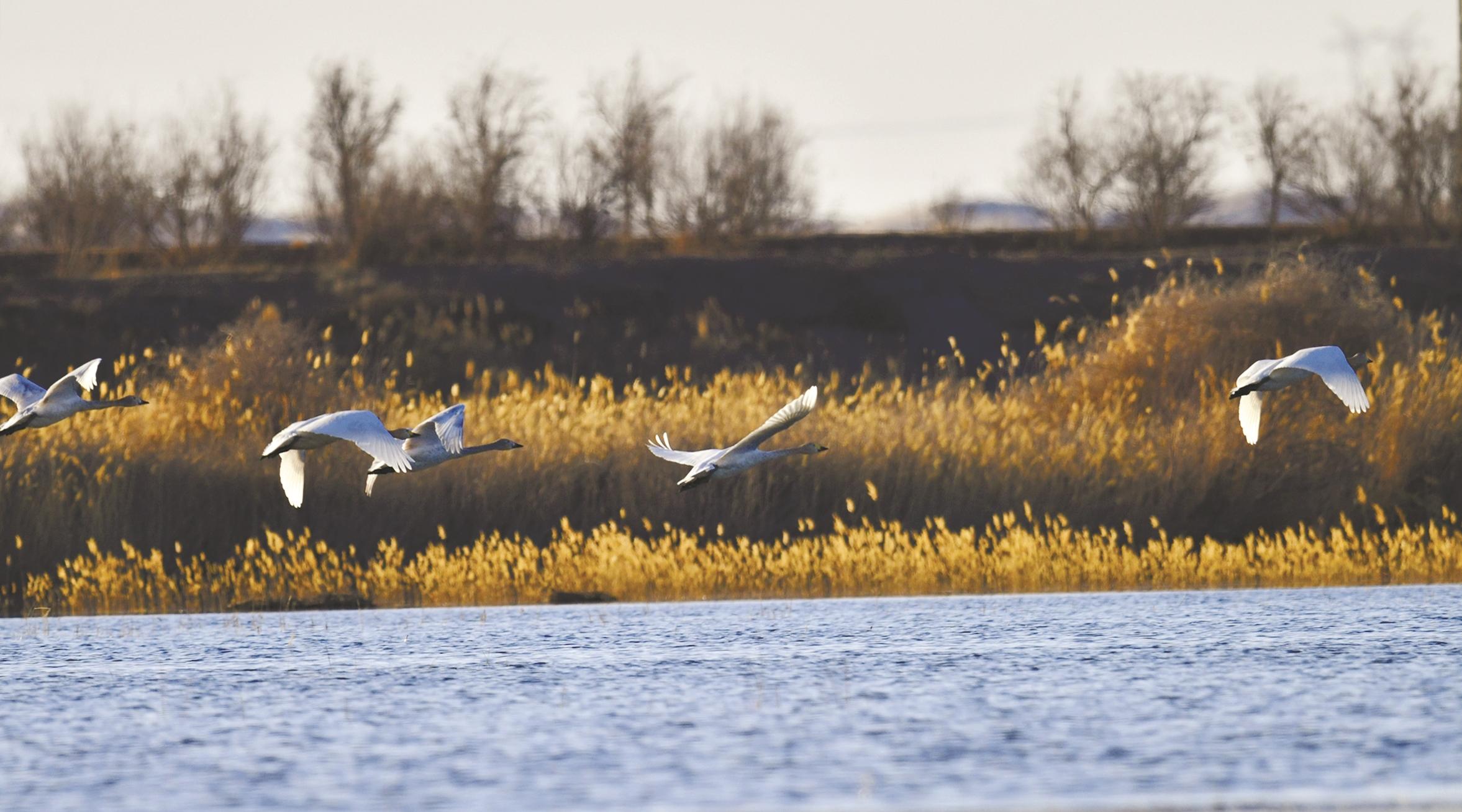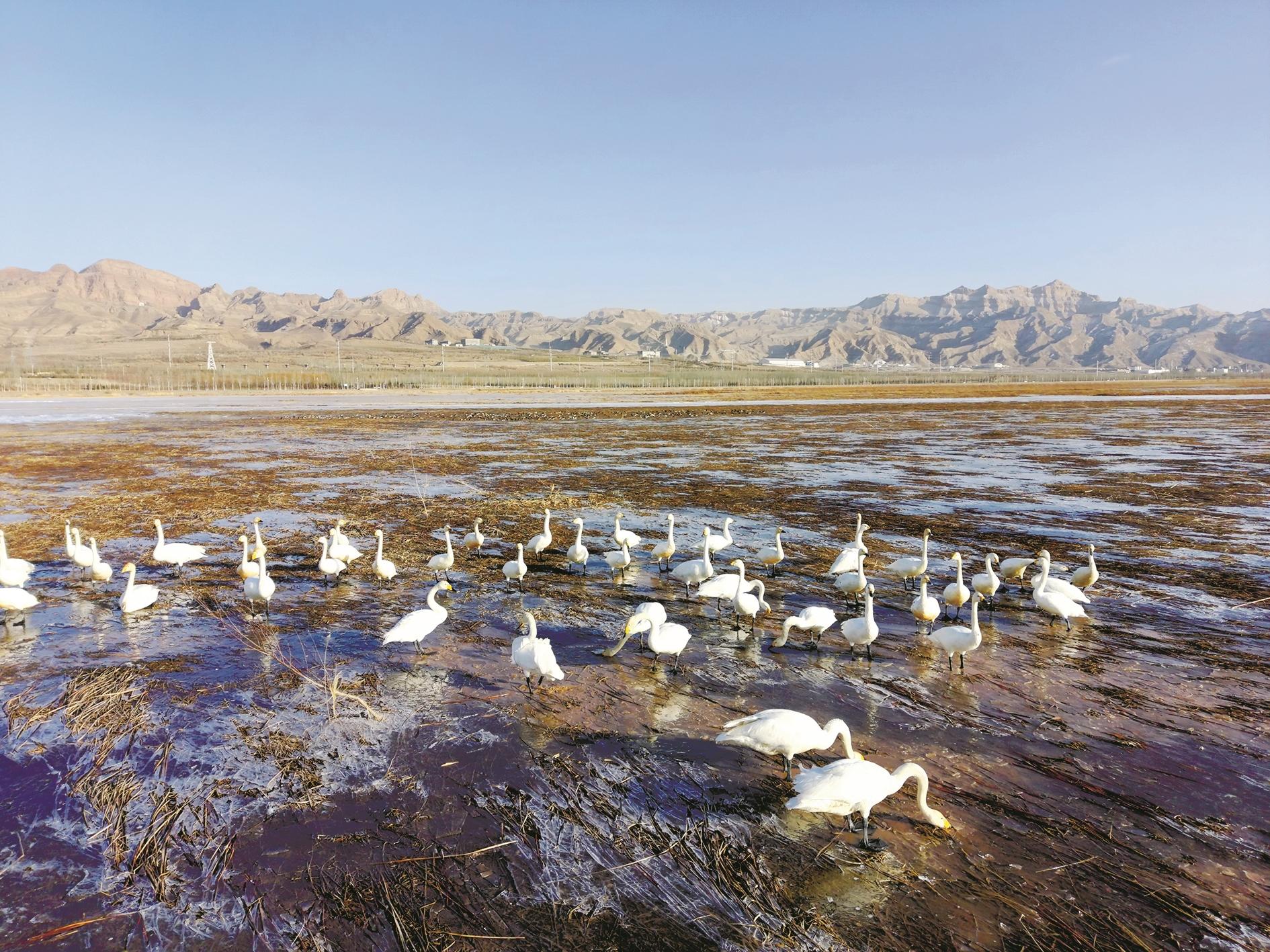 连日来,乌海湖迎来数百只天鹅、赤麻鸭在河道浅滩栖息觅食,沉寂了一冬的水面热闹了起来,勾勒出了一幅生动和谐的春日美景。(王超 摄)