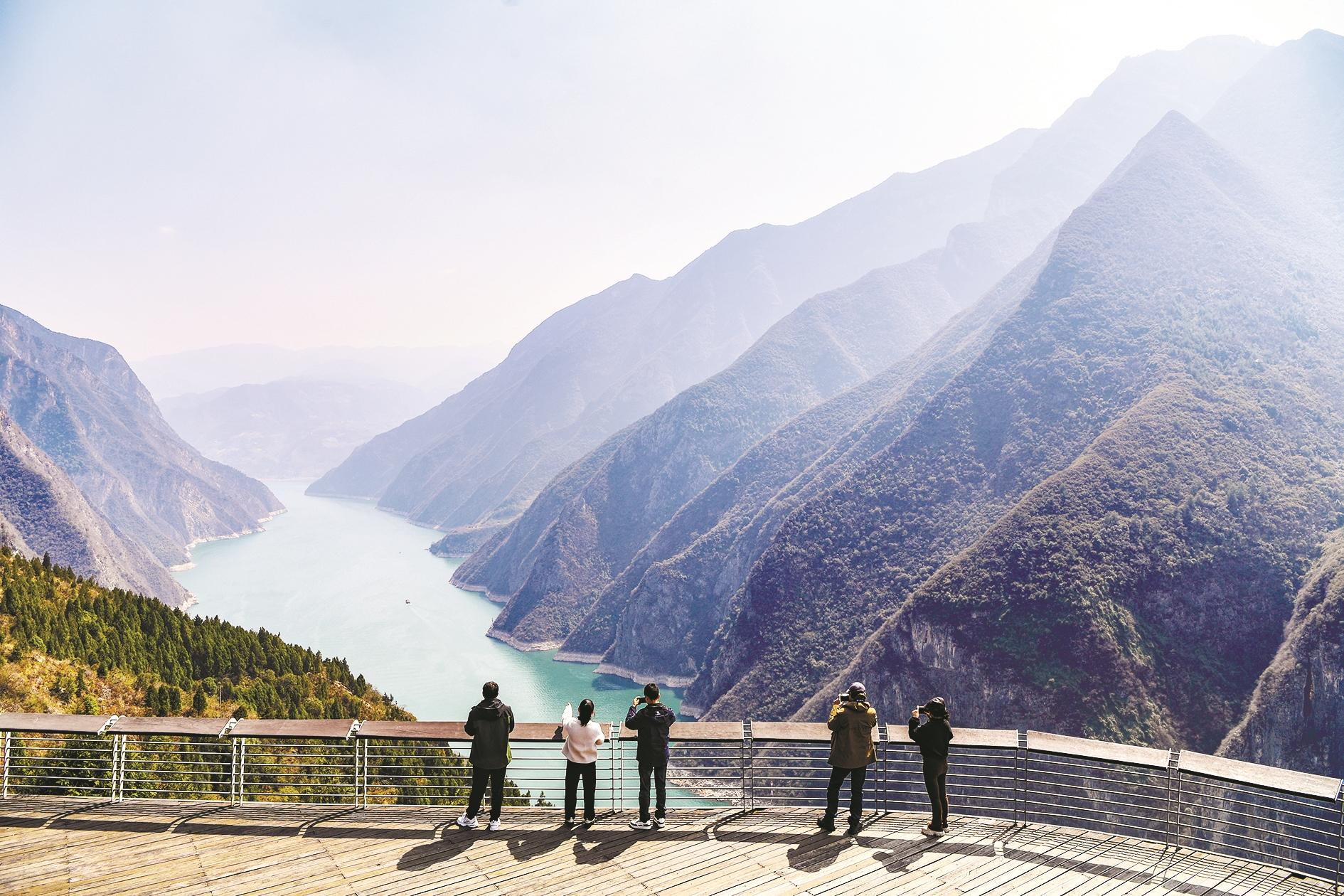 3月11日,游客在重庆奉节瞿塘峡边的观景台游览。