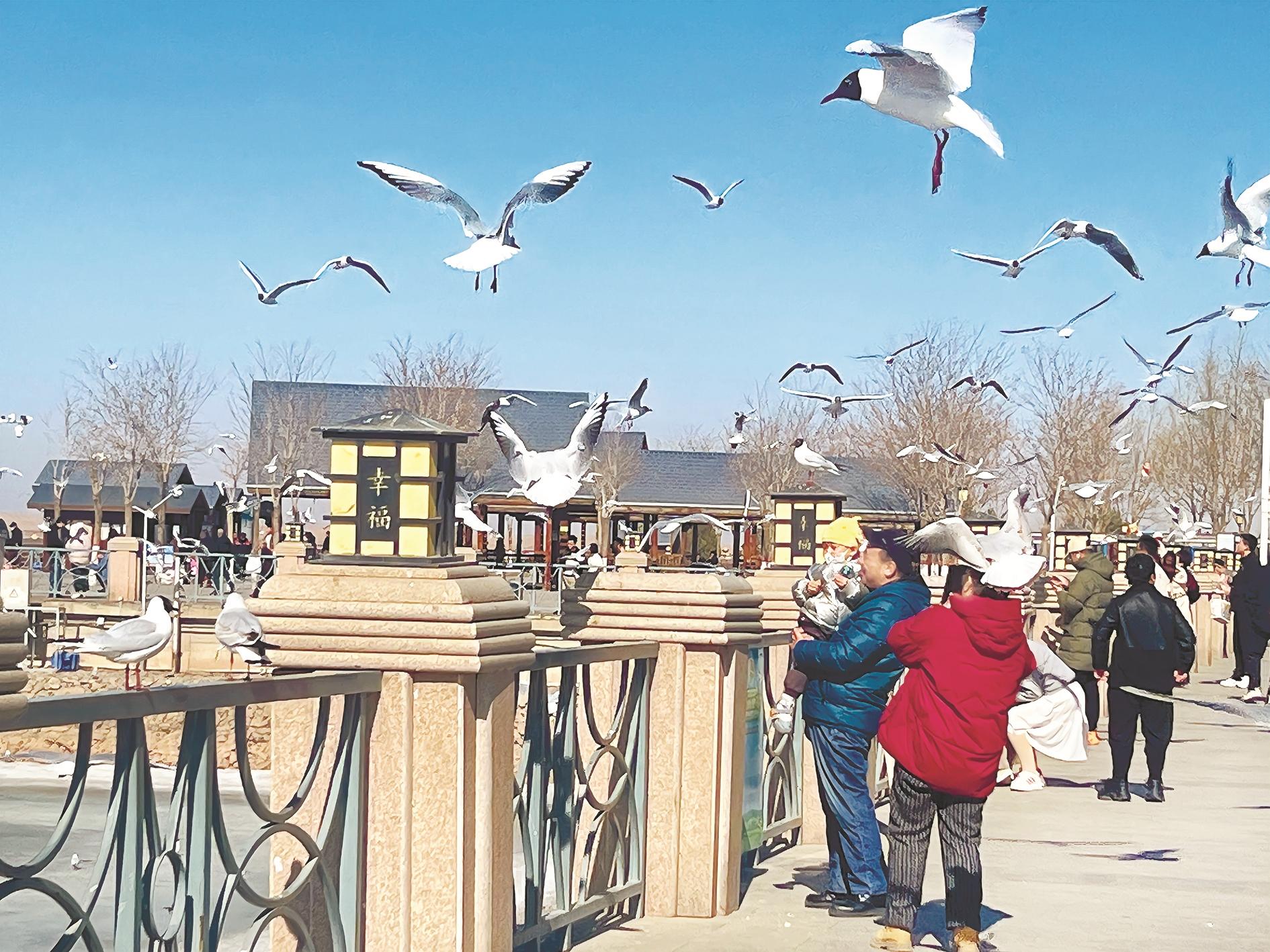 候鸟归来春意浓。近日,随着气温的回升,大批红嘴鸥再度光临乌海湖。碧波荡漾的湖面上,它们逐水嬉戏、展翅翱翔。游客们争相与这些“水上精灵”合影,构成一幅人与自然和谐共生的动人图景。 (苏如娜 摄)